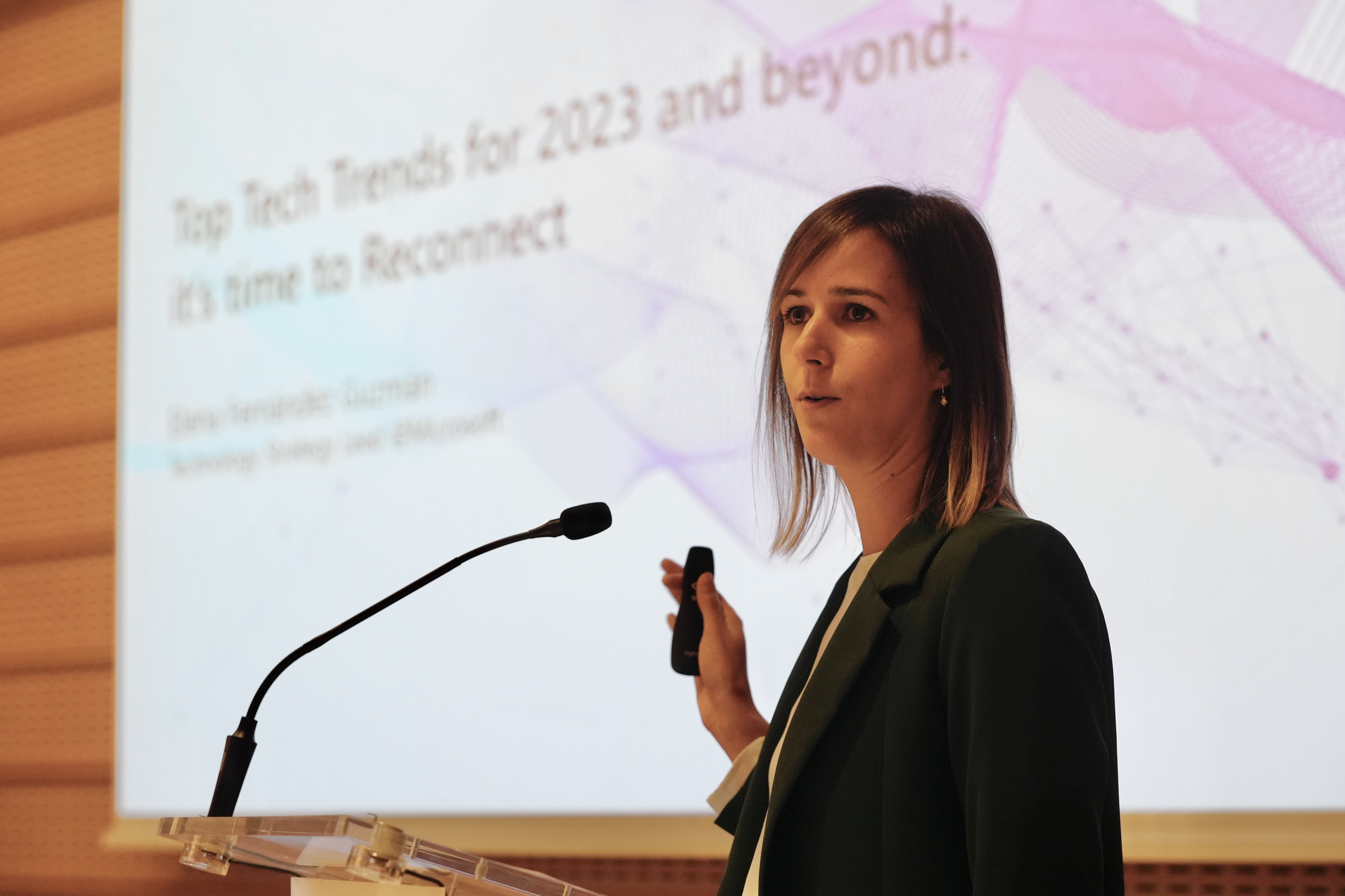 El programa de l’acte ha inclòs la ponència de l’actual Digital & Tech Strategy Lead for Retail & Consumer Goods de la companyia Microsoft, Elena Fernández Guzmán, qui ha parlat de les tendències tecnològiques que es preveuen per als anys vinents i de com aquestes impactaran en la realitat de les empreses i la societat en general.