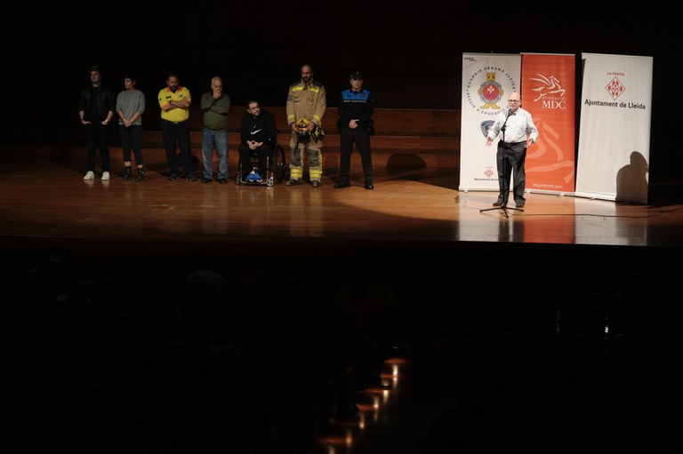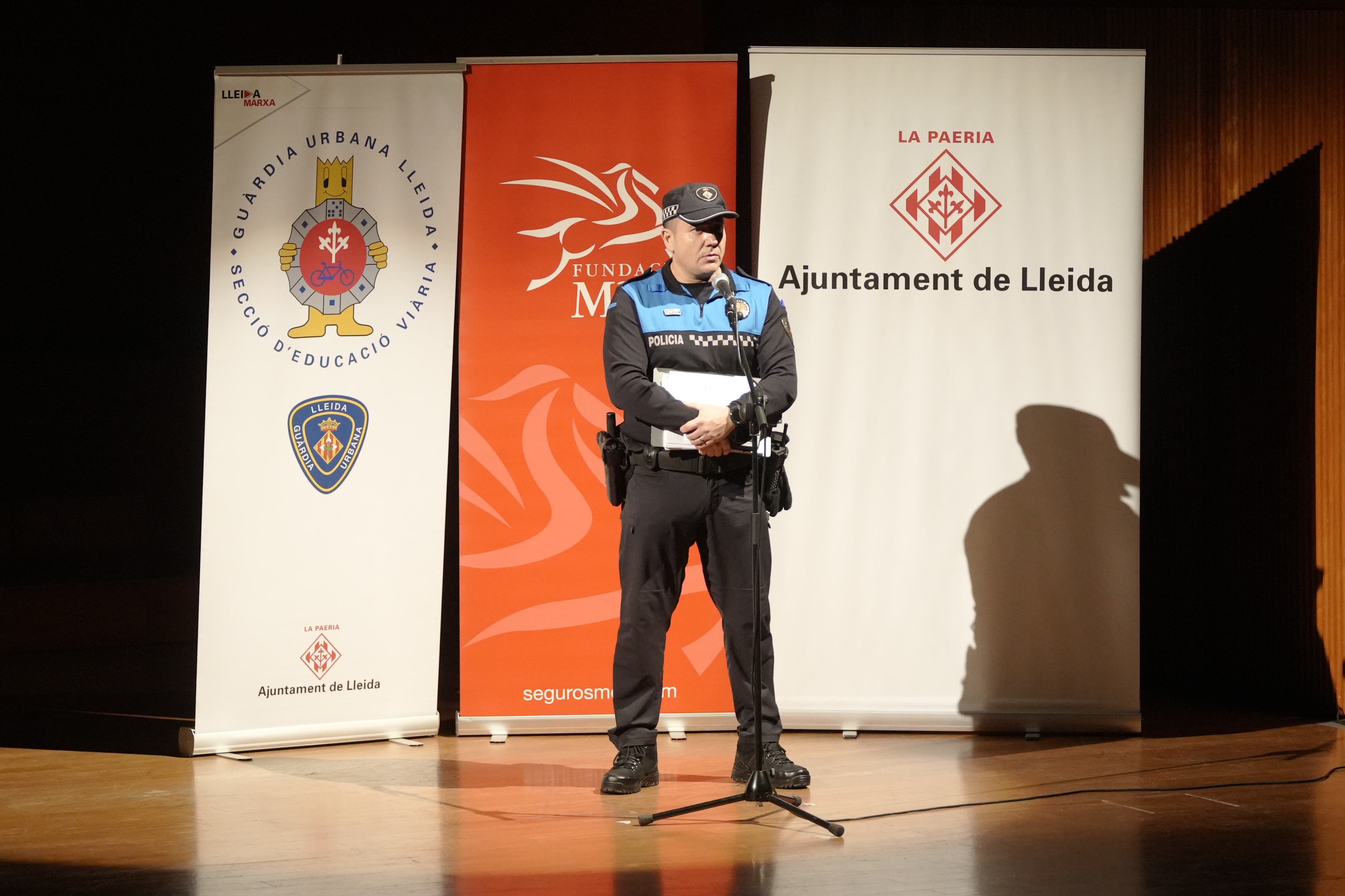 L’alcalde de Lleida, Miquel Pueyo, acompanyat del regidor de Mobilitat, Joan Ramon Castro, l’intendent de la Guàrdia Urbana, Josep Ramon Ibarz, i el President de la Fundació Mutual de Conductors, Joan Badenes, ha presidit aquest matí la representació teatral que ha tingut lloc a l’Auditori Enric Granados i que dona el tret de sortida a aquest projecte educatiu.