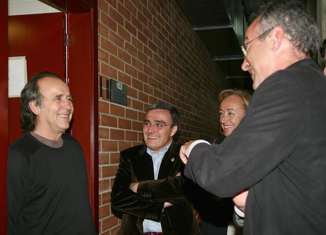 L'alcalde de Lleida, Àngel Ros, i el tinent d'alcalde Xavier Sàez van saludar el cantautor Joan Manuel Serrat després de la seva actuació aquest divendres a la nit al Pavelló Barris Nord de Lleida. Serrat va presentar davant de 3.000 persones el seu darrer treball discogràfic titulat Mô.