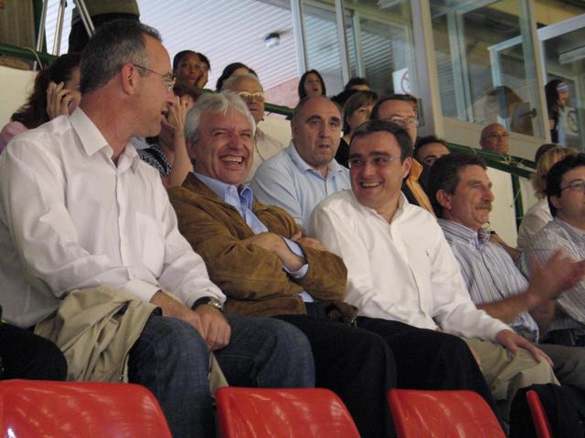 L'alcalde de Lleida, Àngel Ros, i el tinent d'alcalde Xavier Sàez presencien la victòria de les lleidatanes en companyia del secretari general de l'esport de la Generalitat, Rafel Niubò