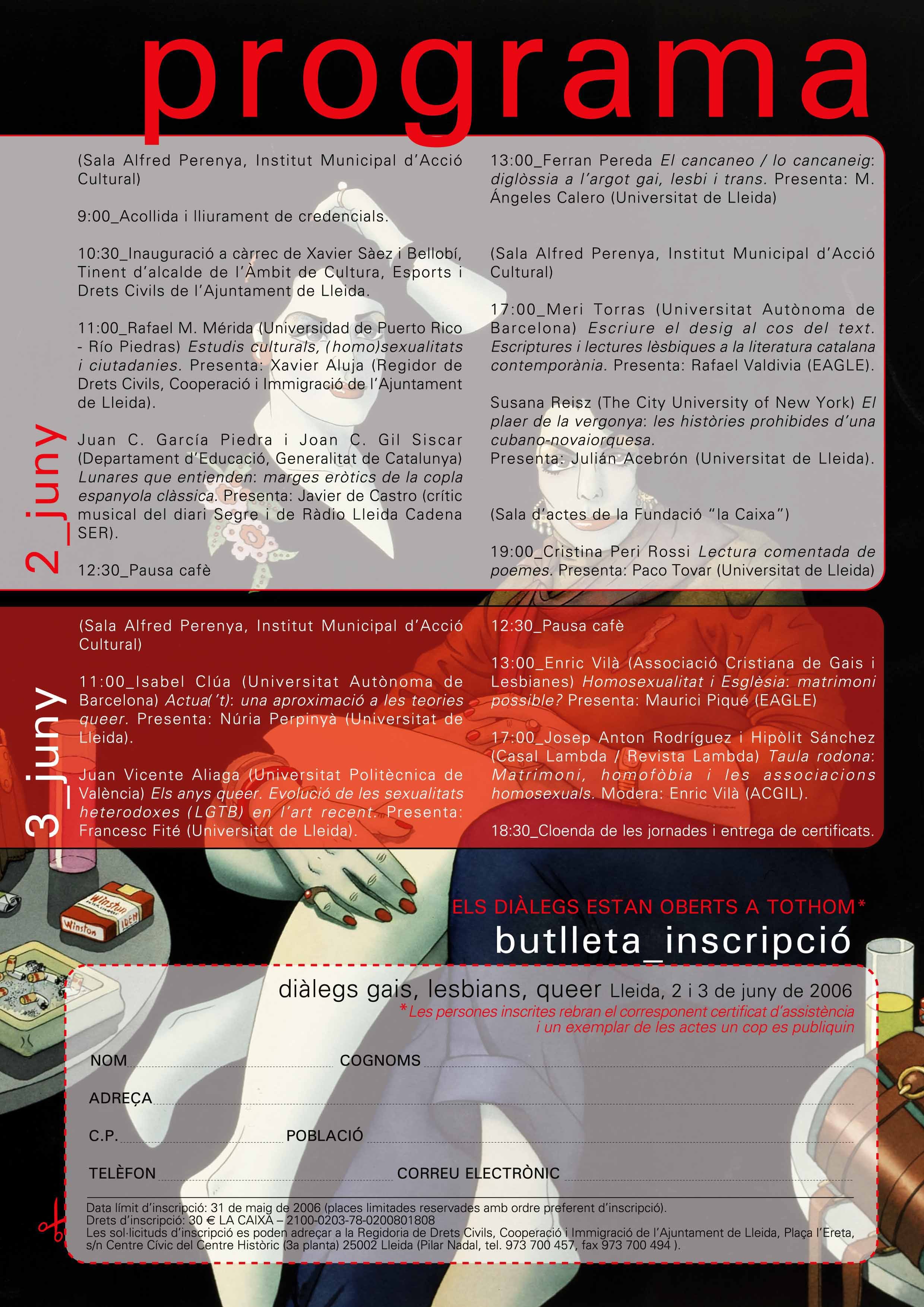 Els diàlegs, organitzats amb la col·laboració de la Universitat de Lleida, EAGLE, casal Lambda i la Fundació la Caixa, comptaran amb la participació de professors universitaris com Rafael M. Mérida (Universidad de Puerto Rico-Río Piedras), Juan C. García Pedra i Joan C. Gil Siscar, del departament d'Educació de la Generalitat de Catalunya o Susana Reizs (The City University of New York, o Isabel Clúa, de la Universitat Autònoma de Barcelona i representants de diferents moviments com Enric Vilà (Associació Cristiana de Gais i Lesbianes) o Josep Anton Rodríguez i Hipòlit Sànchez del Casal Lambda.
