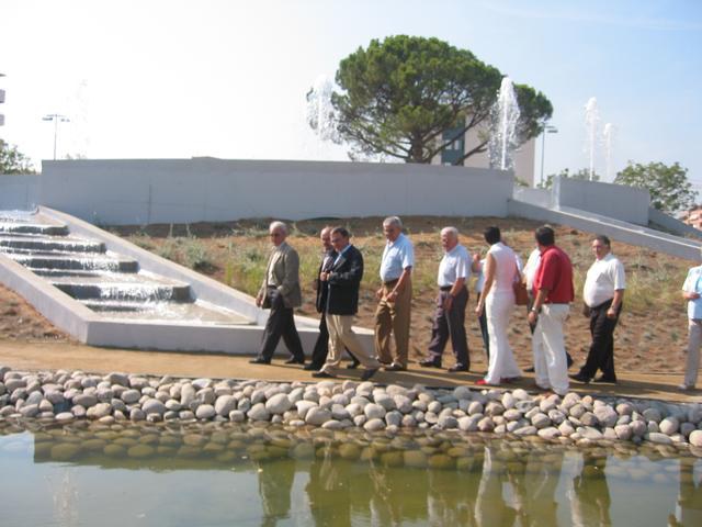 L’enjardinament de la plaça s’ha articulat també per mitjà de tres nivells de terrasses amb sortidors d’aigua, en les quals s’hi han plantat gramínies combinades amb plantes de flor i arbustives. El projecte de la rotonda inclou també un talús en un dels marges de la font on s’han construït quatre canals baixants amb esgraons, per on vessa l’aigua recollida dels sortidors per la cubeta de la font. En aquesta zona s’ha realitzat una plantació arbustiva i de gramínies. Al voltant dels estanys s’hi han afegit també cedres i llorers.