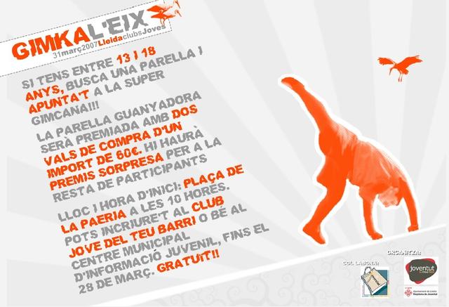 Gimkal’Eix es durà a terme el dissabte, 31 de març a partir de les 10h prenent com a punt de sortida la plaça de la Paeria. La inscripció es pot fer al Club Jove de cada barri o bé al Centre Municipal d’Informació Juvenil, fins el 28 de març. La inscripció a l’activitat és gratuïta.