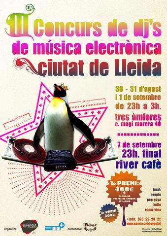 Després d’una fase classificatòria que ha resultat tot un èxit, amb la participació de DJ’s de tota Catalunya, arriba la gran final del III concurs de DJ’s ciutat de Lleida. L’esdeveniment tindrà lloc divendres, a partir de les 00.00 hores, al local River Cafè dels Camps Elisis de Lleida.