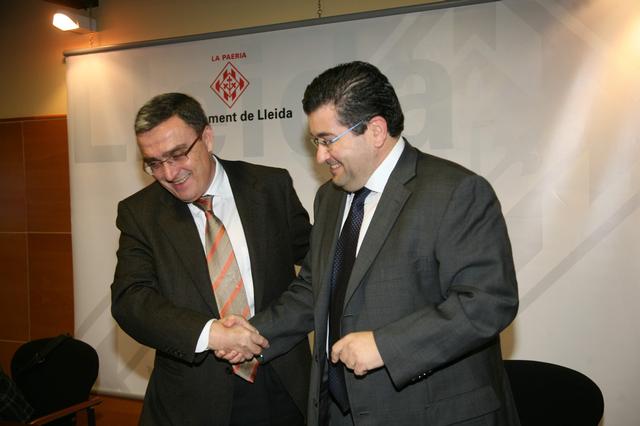 L'alcalde de Lleida, Àngel Ros, i el delegat de la Caixa, han signat avui el conveni de col·laboració que permet desenvolupar el programa