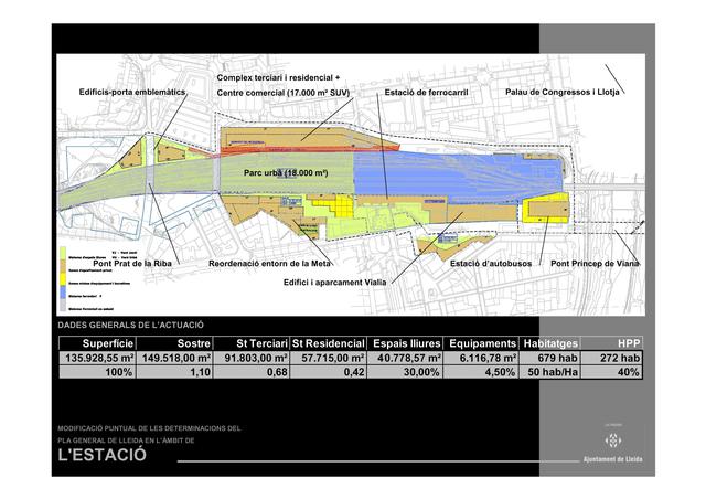 L’alcalde de Lleida, Àngel Ros, ha presidit aquest divendres la Comissió Informativa Extraordinària d’Urbanisme, Medi Ambient, Mobilitat i Seguretat en què s’ha tractat la modificació del Pla General en l’àmbit de l’Estació i s’ha avançat el nou pla de millora urbana que substituirà l’anterior Pla Especial del 2003. La modificació afecta a les condicions de l’ordenació en l’àmbit del Pla Especial, de gairebé 14 hectàrees de superfície i que suposarà una nova centralitat a la ciutat amb edificacions singulars de referència. La modificació del Pla General en l’àmbit de l’Estació establirà uns nous aprofitaments urbanístics incrementant l’ús residencial del conjunt de l’àmbit, en proporció a la nova generació d’espai públic que s’aconsegueix amb el nou cobriment de les vies. Es proposa incrementar l’edificabilitat amb un màxim de 679 habitatges (davant dels 472 actuals). A més, es garantirà un major nivell d’integració social incorporant les reserves d’habitatge protegit, que no estava contemplada en el pla especial vigent. Així, entre els punts més destacats de la nova ordenació, es troba la reserva d’habitatge protegit, fixant un percentatge del 40% (20% de règim general, 10% de règim concertat i 10% de concertat català). Això comportarà la creació d’un total de 272 habitatges protegits. La modificació, a més, generarà una nova àrea de centralitat de referència a la ciutat que resultarà de la transformació de l’antic espai residual i de fractura urbana que suposaven les vies, i que permetrà integrar tant l’actual Eix Comercial com les noves activitats que es generin a l’entorn de la Llotja. D’aquesta manera, la nova ordenació aposta per una elevada proporció d’usos terciaris, d’oficines i de comerç (aquest últim incorporant a més la modalitat de centre comercial que preveu el PTSEC de 17.000 m2). És a dir, una mixtura d’usos per garantir la vitalitat i funcionalitat de l’àmbit. Garantir la continuïtat urbana i la intermodalitat Àngel Ros ha subratllat que la modificació del Pla General en l’àmbit de l’Estació pretén garantir la continuïtat urbana entre els barris de la ciutat, històricament separats pel sistema ferroviari, de tal manera que s’han incorporat un nou cobriment de la platja de vies (18.000 m2 i 238 metres de longitud) que estableix noves continuïtats peatonals i una major permeabilitat, tant des de Pardinyes com des de la plaça de Ramon Berenguer IV. L’alcalde ha destacat que “el nou parc urbà comptarà amb un accés per a vianants des de la rambla de Ferran amb una pendent suau, del 6 %, a través dels edifici de l’antiga Farinera La Meta i els Docs”. En aquest sentit, es reordenarà l’edificació per adequar-la a les noves condicions urbanes i les exigències dels nous espais públics. Així, es proposa incrementar les intensitats d’edificació en els fronts del parc del cobriment, que poden tenir un màxim de 10-12 plantes, deixant menys denses les façanes més properes a les edificacions ja existents a Pardinyes, amb un màxim de set plantes a Roger de Llúria. La tipologia en torre se situa a la perspectiva de la nova prolongació de Prat de la Riba en tant que “edificis-porta emblemàtics”. Així mateix, la torre que s’havia establert al carrer Alfarràs en l’anterior Pla Especial s’endarrereix en relació a les edificacions existents i passa de 23 a 15 plantes. La modificació garantirà la intermodalitat amb el trànsit ferroviari existent i la incorporació de l’estació d’autobusos interurbans. Així, l’estació d’autobusos es localitza en una nova ubicació, amb sortida a l’avinguda del Segre i, a més, tindrà connexió amb el complex i pàrquing de Viàlia. Increment de zones verdes i equipaments La modificació assegura un major increment de zones verdes i equipaments, de tal manera que s’augmenta el sostre però s’incrementa molt més la proporció de zones verdes i equipaments, superant àmpliament les reserves previstes per llei. Així, s’assoleixen un total de 46.895 m2 (40.778 d’espais lliures i 6.116 d’equipaments), quan el mínim normatiu estaria fixat en 33.642 m2. Per tant, es garanteix un índex de 31,36 m2 d’espais lliures i equipaments per cada 100 m2 de sostre, per sobre de l’índex de l’actual pla especial. Es fixen les condicions per assegurar l’eliminació i trasllat de les instal·lacions industrials existents, incompatibles amb els nous usos urbans, a través d’un nou repartiment de beneficis i càrregues que permeti garantir la viabilitat econòmica d’una de les unitats d’actuació de l’àmbit, la UA 3 (corresponent a la Meta i Docs i d’altres propietaris). El paer en cap ha destacat que el Pla de Millora Urbana preveu la conservació de part de les voltes del Docs i de la façana modernista de la Farinera La Meta, un edifici on es podran construir oficines o habitatges. L’alcalde ha afegit que ja existeix un acord amb la Farinera per tal de fer efectiu el cessament de l’activitat en dos anys i mig. El nou Pla de l’Estació assegura en tot l’àmbit la seva viabilitat econòmica, que s’ha previst que sumi aproximadament uns costos d’uns 75 milions d’euros.