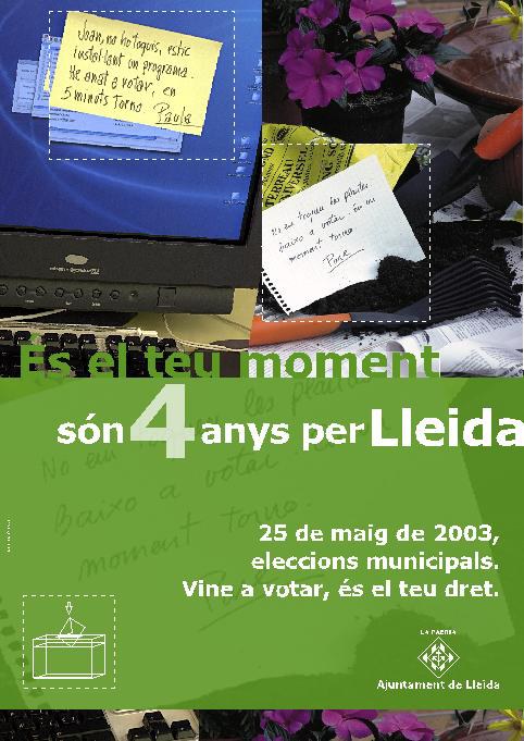 L'Ajuntament de Lleida ha donat a conèixer la campanya institucional per a les eleccions municipals que se celebraran el 25 de maig, amb el lema És el teu moment. Són 4 anys per Lleida