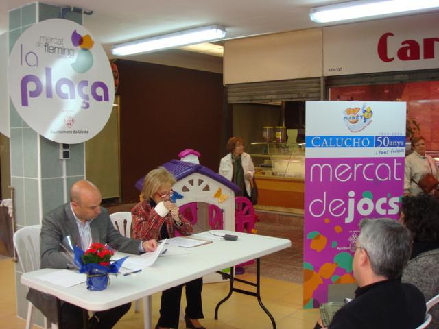 La tinenta d'alcalde Dolors Arderiu, presidenta de l’Institut Municipal de Comerç, Mercats i Consum de Lleida ha presentat avui la nova campanya de dinamització dels Mercats Municipals: “el nadal ens prova!”. La capacitat innata dels mercats per a adaptar-se als productes de temporada i la importància de la gastronomia en les festes de Nadal, són els eixos d’aquesta campanya que aplega un ampli ventall d’activitats adreçades a tot tipus de públic. L’acció es desenvolupa dins del Pla de Dinamització 2008/09 dels Mercats Municipals de Lleida endegat amb el suport de Comerç Catalunya, marca de la Generalitat de Catalunya. El Mercat de Jocs: un nou espai per als més petits Coincidint amb la presentació de la campanya ha tingut lloc la signatura del conveni mitjançant el qual la botiga de joguines Calucho, assumeix el patrocini del Mercat de Jocs, un espai permanent adreçat als més petits. La transformació de les places dels mercats municipals de Balàfia i Ronda-Feming en àrees de repòs permanents equipades amb mobiliari i joguines, suposa la integració definitiva en l’activitat quotidiana del mercat d’aquests espais interactius inaugurats el passat mes d’octubre. Aquesta nova utilitat de les places és una mostra més de la vocació de servei i voluntat d’adaptació dels Mercats Municipals als nous consumidors, amb l’objectiu d’incentivar la visita de famílies i adults amb nens al seu càrrec. Una agradable forma de conciliar el temps i la motivació dels qui venen a comprar i els qui els han d’acompanyar. El conveni ha estat signat per Dolors Arderiu i Rafel Peris, administrador de la societat Jaume Calucho, s.a.