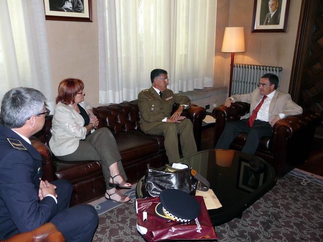 L'alcalde, Àngel Ros, i la regidora Sara Mestres rebran han rebut aquest matí Coronel Delegat de Defensa a Lleida Agustín Álvarez, un cop finalitzada la seva estapa a Lleida per desenvolupar aquest càrrec.
