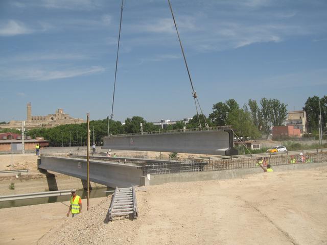 L’Ajuntament de Lleida ha iniciat aquest dilluns la col•locació de les bigues de la rotonda que ha de salvar el canal de Seròs al camí de Picos i que format part del vial de prolongació de Príncep de Viana. En aquest sentit, cal destacar que per fer aquesta rotonda, s’han de construir abans dos ponts per passar per sobre del canal, un per cada sentit, i que es recolzaran sobre una cimentació feta amb micropilots. Aquesta actuació, que es farà durant tot el dia d’avui, comporta la col•locació de 5 bigues prefabricades a cada pont, amb una longitud de 23 i 27 metres, respectivament (s’adjunten fotografies).