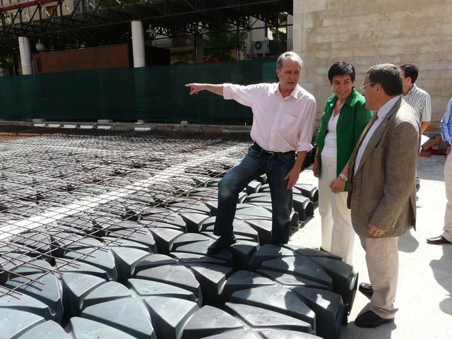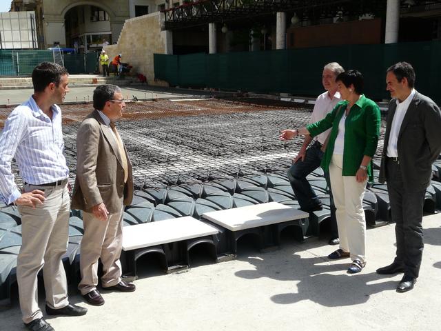 Les obres de rehabilitació consisteixen en la construcció d’una llosa in situ, amb cassetons lleugers de PVC a mode d’encofrat, que permeten l’entrada de formigó entre ells per poder executar els pilars de suport, i una malla electrosoldada de 15x15. El nou paviment serà de pedra calcària de 60x90, de 4 cm de gruix.