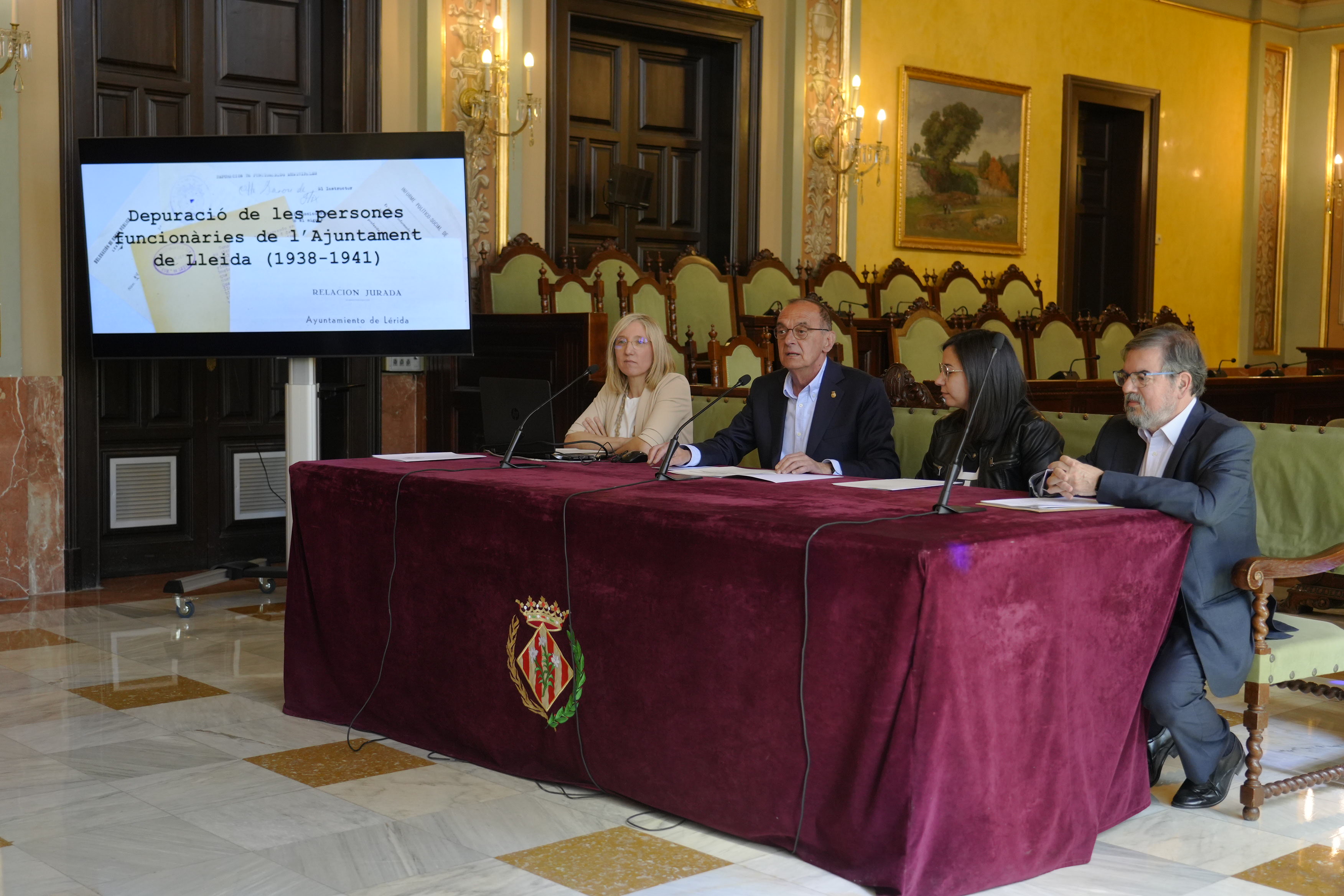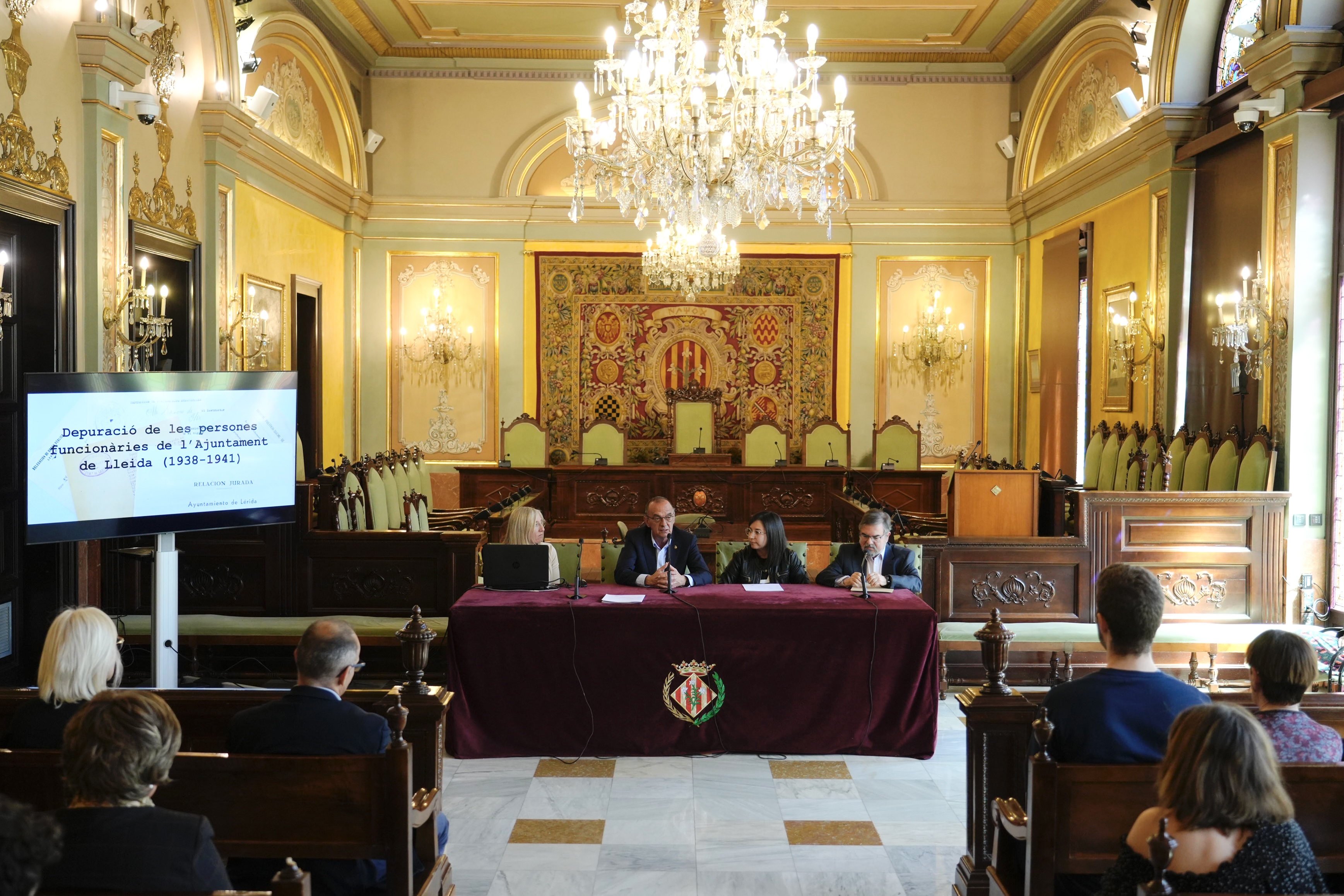 El Saló de Sessions de la Paeria ha acollit aquest dilluns l’acte de restitució de la dignitat de les persones funcionàries depurades a l’Ajuntament de Lleida, en el període de 1938 a 1941. El paer en cap, Miquel Pueyo, ha presidit l’acte en què s’ha explicat el treball de recerca que s’ha fet al respecte i l’activació d’un cercador a la pàgina web de l’Arxiu Municipal on es podrà identificar els i les treballadores que van ser víctimes de la repressió franquista. Pueyo ha agraït el treball que ha desenvolupat en aquest estudi l’exsecretari de la Paeria i actual síndic de la Universitat de Lleida, Jesús Gutiérrez, i la tasca de l’Arxiu Municipal, encapçalat per Iolanda Enjuanes.