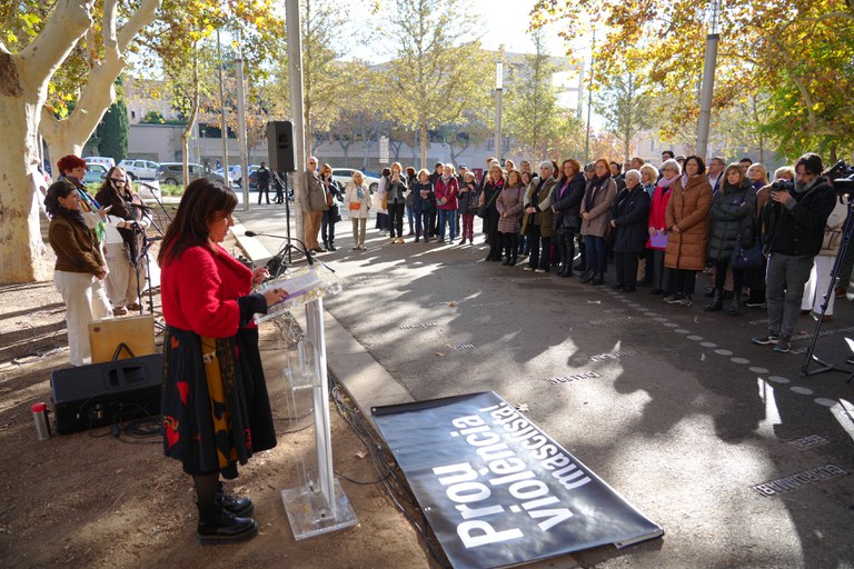 El moment àlgid d’aquesta commemoració ha estat  la lectura del Manifest pel 25N que esdevé una Declaració Unitària Institucional i que ha estat llegida per Raquel Aznar. Supervivent de violència de gènere, fotògrafa de professió, també és tècnica d’igualtat i autora de l’exposició ‘Crits’ en què es fan visibles diferents situacions de violència masclista i es mostra la vulnerabilitat de les dones en aquestes situacions.