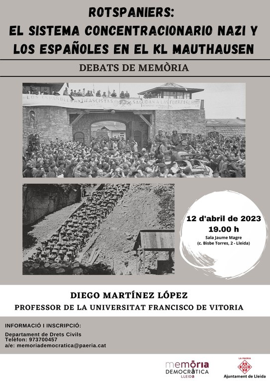 El programa d’activitats de l’àrea de Memòria Democràtica inclou tres activitats per aquest mes d’abril. La primera és una nova edició de Debats de Memòria aquest dimecres, dia 12, amb el títol “Rotspaniers: el sistema concentracionario nazi y los españoles en el KL Mauthausen”. La conferència serà a càrrec del Doctor en Història Contemporània i Professor en la Universitat Francisco de Vitoria, Diego Martínez López.