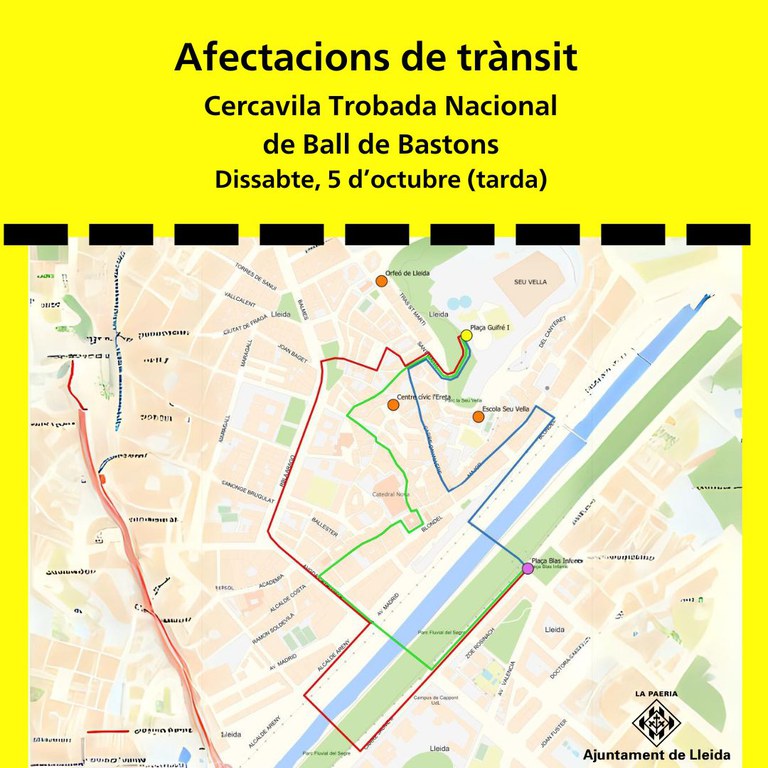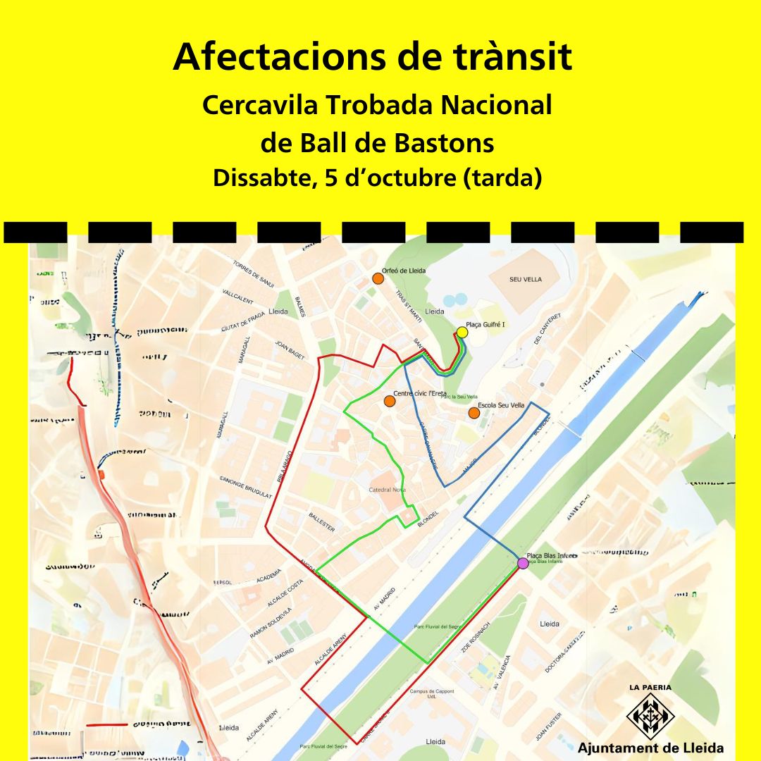 La cercavila en motiu de la celebració de la 49a Trobada Nacional de Ball de Bastons aquest dissabte a la tarda comportarà afectacions al trànsit. La Guàrdia Urbana regularà la circulació aquest dissabte a la tarda per minimitzar l’afectació durant l’esdeveniment i garantir la seguretat de tota la ciutadania.
