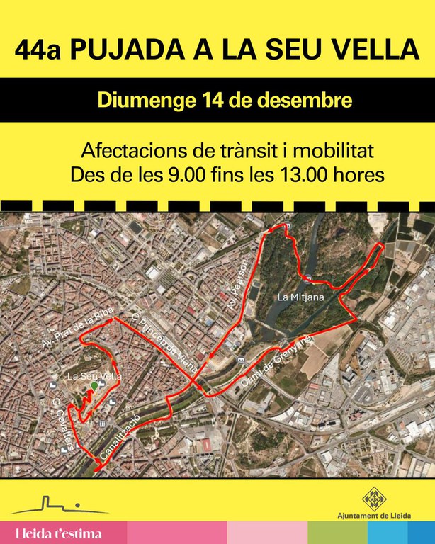 Lleida tornarà a reviure la tradicional Pujada a la Seu Vella de Lleida aquest diumenge amb la celebració d’una caminada i una cursa atlètica. La 44a edició, que tindrà lloc aquest diumenge, 14 de de desembre, durant tot el matí, comportarà diversos talls i desviaments de trànsit pel centre de la ciutat.