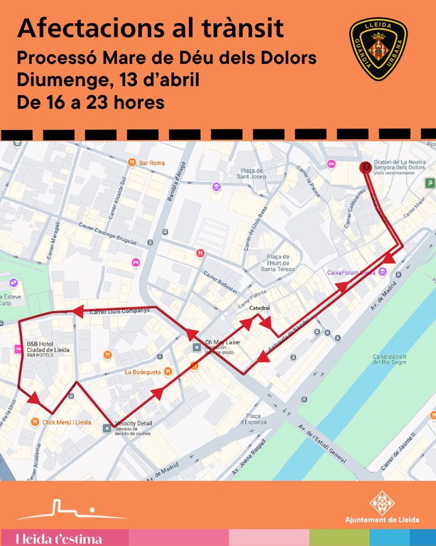 La Guàrdia Urbana vetllarà per pel bon funcionament del trànsit durant la Processó de la Mare de Déu dels Dolors, que tindrà lloc aquest diumenge a la tarda-nit a Lleida. L’itinerari de la processó s’iniciarà al carrer Cavallers i seguirà per l’avinguda de Blondel, avinguda de Catalunya, carrer Lluís Companys, carrer Unió, carrer Templers, carrer Acadèmia, carrer República Paraguai, carrer Alcalde Costa, avinguda de Catalunya, carrer Sant Antoni, plaça de la Catedral, carrer Major, carrer Vila de Foix, avinguda Blondel i carrer Cavallers.