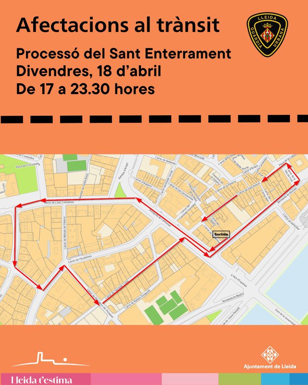 La Guàrdia Urbana de Lleida vetllarà pel bon funcionament del trànsit durant la processó del Sant Enterrament, que tindrà lloc aquest divendres. Els agents del cos de policia local regularan la circulació per minimitzar l’afectació durant l’esdeveniment per garantir la seguretat de tots els participants.