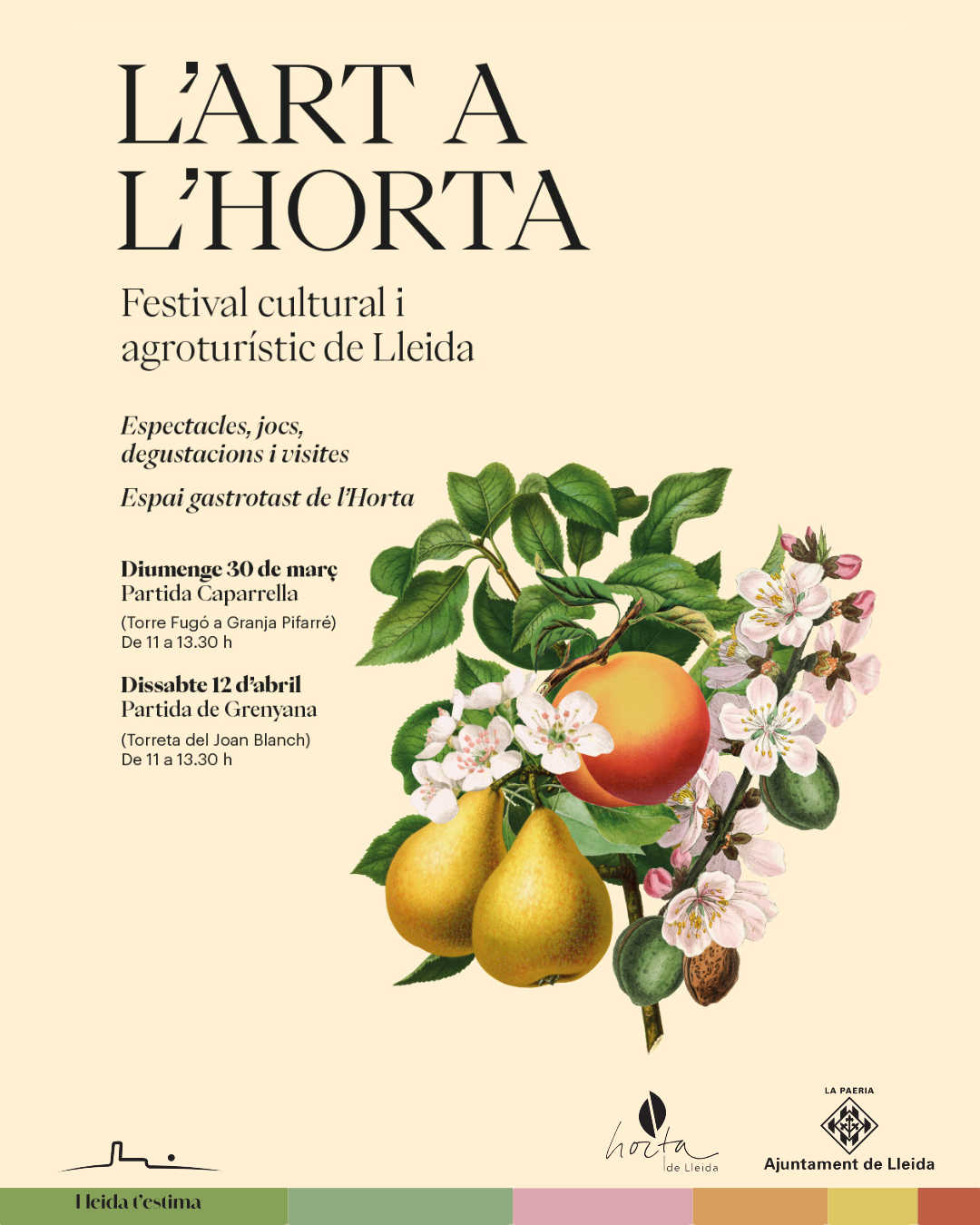 L’Horta de Lleida tornarà a omplir-se d’arts escèniques i degustacions de productes de quilòmetre 0 el pròxim dissabte, 12 d’abril, en el marc del festival cultural i agroturístic L’Art a l’Horta. Aquesta vegada, l’activitat se centrarà a la Partida de Granyana. Per afavorir una mobilitat sostenible fins a Torreta del Joan Blanch, hi haurà autobusos gratuïts des del centre de la ciutat i una bicicletada gratuïta amb inscripció prèvia en aquest enllaç.