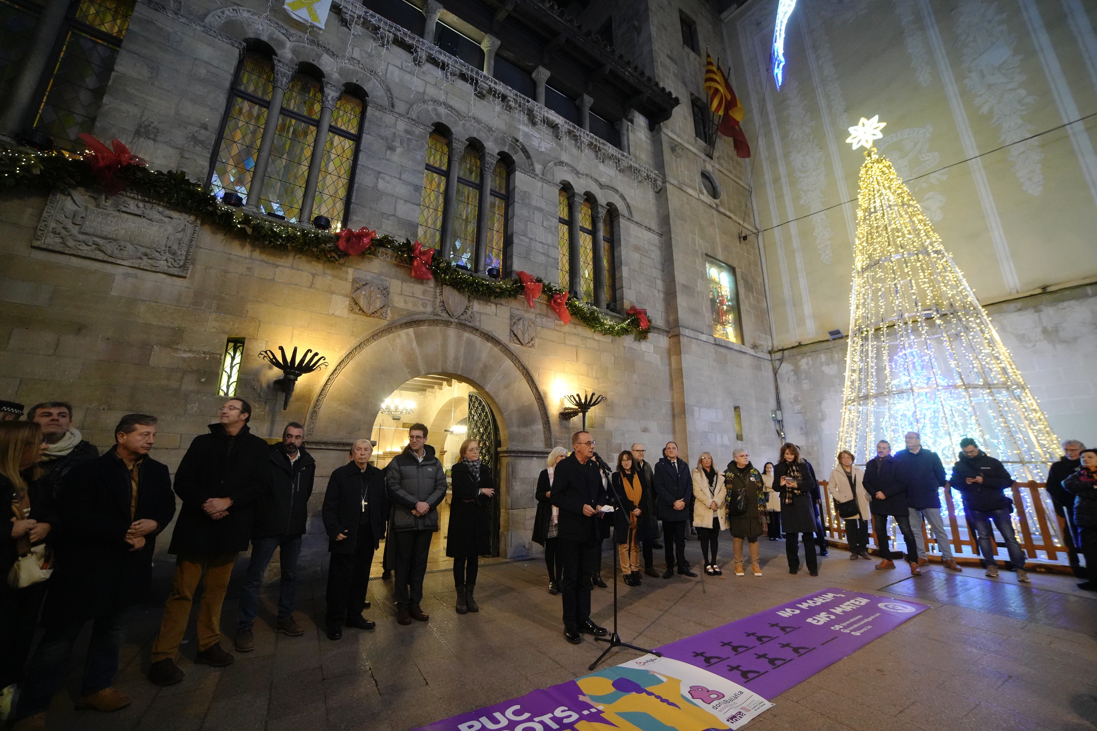 La Plaça Paeria acull la lectura del manifest elaborat pel Grup de Treballl de Violències Masclistes del Consell municipal de les Dones. El paer en cap i la secretaria general del Departament de Feminisme presideixen l’acte al capdavant d’una nombrosa representació institucional