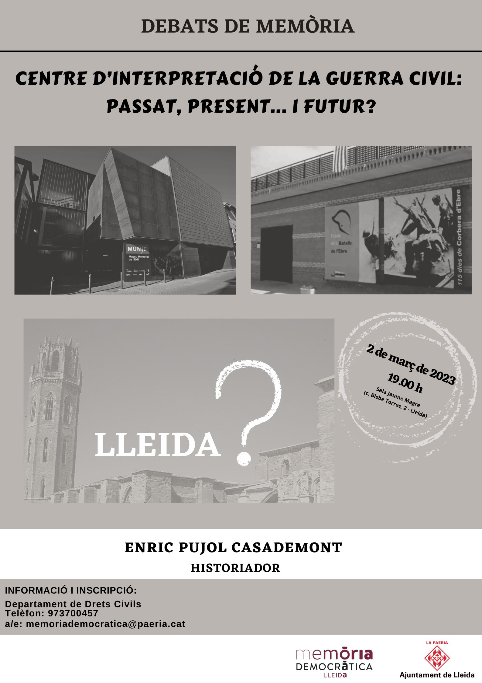 L’Àrea de Memòria Democràtica de la Regidoria d’Educació, Cooperació, Drets Civils i Feminismes de l’Ajuntament de Lleida organitza una nova edició de Debats de Memòria per aquest dijous, 2 de març, sobre el “Centre d’Interpretació de la Guerra Civil: passat, present ... i futur?”.