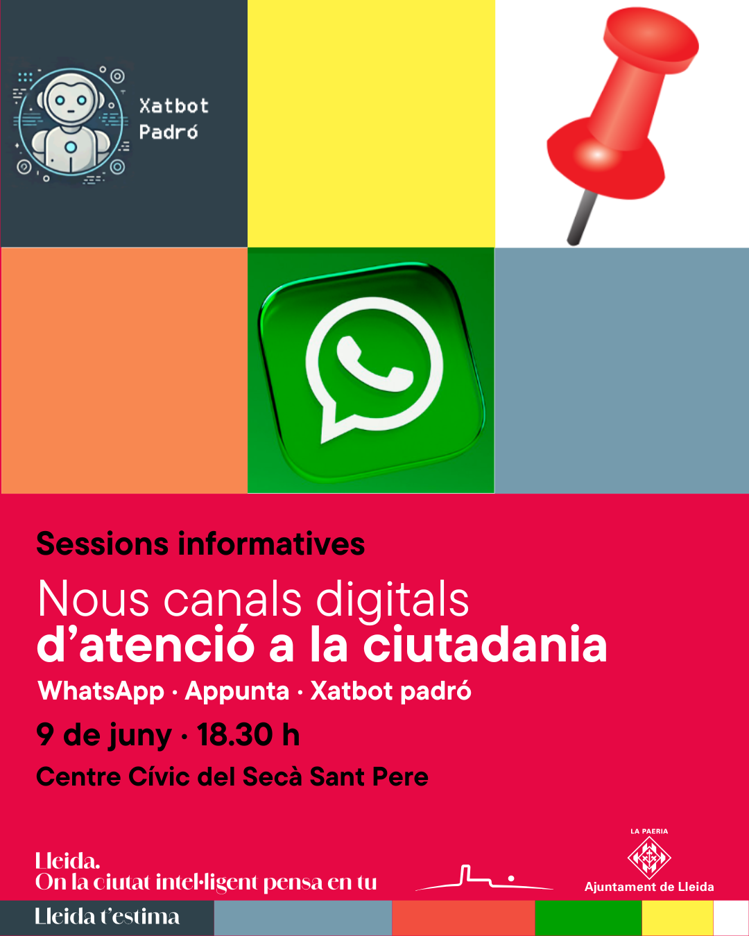 La Paeria continua les xerrades informatives als centres cívics i locals socials de tots els barris de la ciutat per tal de difondre les noves eines de comunicació directa amb la ciutadania: el canal de WhatsApp de l’Ajuntament, un xatbot que permet fer consultes sobre el procediment d’empadronament i l’actualització de l’aplicació per a telèfons mòbils Appunta, que permet alertar sobre incidències a la via pública.