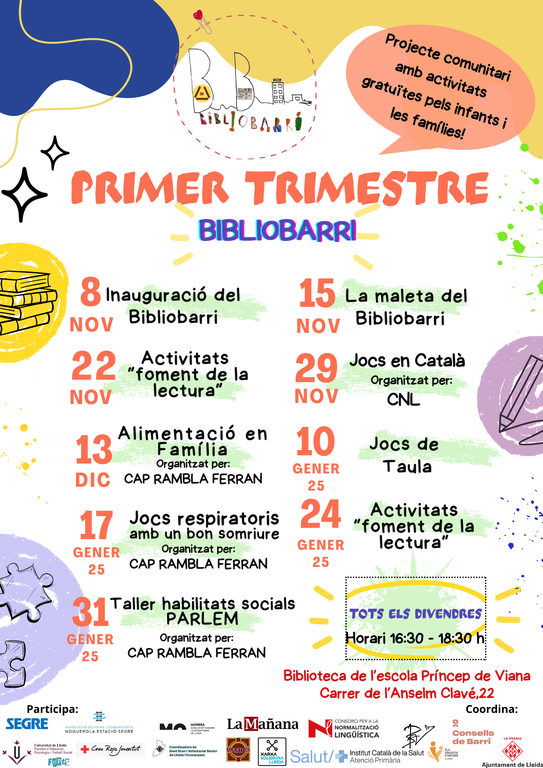 El projecte Bibliobarri ha iniciat la temporada del curs 2024/2025 a la biblioteca de l’escola Príncep de Viana. Aquesta iniciativa permet la possibilitat d’obrir aquest espai educatiu a la comunitat per respondre a una necessitat de manca d’espais per als infants i les famílies de la zona. El projecte va començar el curs passat i se li ha donat continuïtat davant la bona acollida que ha tingut entre les famílies. La biblioteca del centre estarà oberta a tota la ciutat els divendres a la tarda, de 16.30 a 18.30 h.