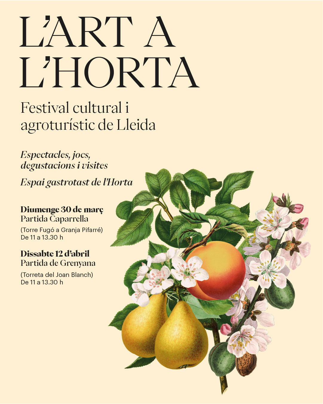 El 30 de març s’inaugurarà la segona edició del festival cultural i agroturístic de Lleida L’Art a l’Horta. Després que la regidoria de Cultura ha hagut d’ajornar dues vegades l’inici de la nova temporada per les pluges de les darreres setmanes, es preveu que la primera sessió de l’any ofereixi, aquest diumenge, una programació carregada d’arts escèniques, història, floració i productes alimentaris de proximitat per convidar tothom a gaudir del cinturó verd de Lleida. Les activitats, que aquesta vegada es faran a la Partida de la Caparrella, són gratuïtes.