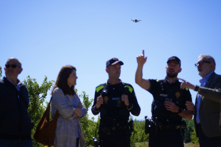 El paer en cap, Fèlix Larrosa, acompanyat de la tinenta d’alcalde i regidora de Seguretat, Mobilitat i Civisme, Cristina Morón, ha visitat aquest divendres la partida de Butsènit on els 6 agents de la Guàrdia Urbana que s’han format per poder pilotar-los estaven realitzant pràctiques i entrenaments amb els dos drons.