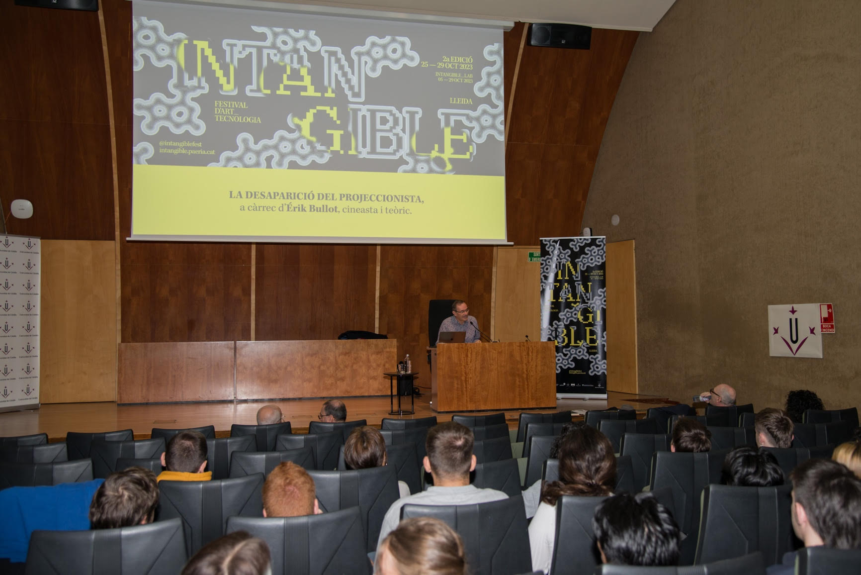 El cineasta i teòric francès Érik Bullot ha mostrat la seva preocupació perquè els algorismes puguin substituir la figura del projeccionista, una feina que ja fa temps que va desaparèixer en les sales de cinema a conseqüència de l’automatització progressiva de la indústria cinematogràfica. “L’algorisme no deixa lloc a què sigui el mateix espectador o cineasta qui adopti aquesta funció tan rellevant que feia el projeccionista en el seu dia”, ha dit.Bullot, que ha ofert la conferència “La desaparició del projeccionista” al Rectorat de la UdL, dins del programa de l’INTANGIBLE_Lab, ha destacat el paper fonamental que tenia el projeccionista i el canvi que ha suposat per al món de cinema la seva desaparició. “El canvi que implica és importantíssim, perquè canvien totalment els usos de la sala, entren en escena internet i les noves plataformes, etc. Alguns artistes han adaptat el seu treball i han pensat en altres formes de pantalles de projecció, el cinema expandit per exemple, i fins i tot alguns ja treballen amb IA”, comenta.