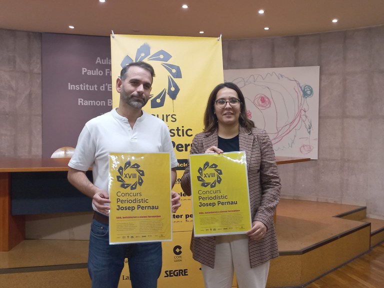 El regidor d’Educació, Xavi Blanco, i la periodista i Presidenta de la Demarcació de Lleida del Col·legi de Periodistes de Catalunya, Laura Alcalde, han presentat la convocatòria 2023- 24 d’aquest premi i la seva imatge i han destacat que, enguany, els premis Josep Pernau arriben a la seva majoria d’edat.