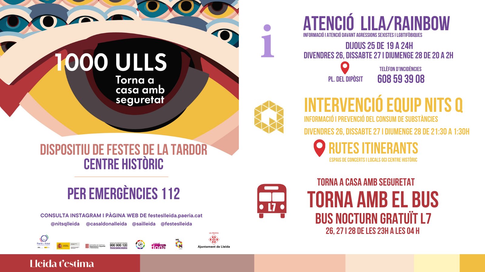 La Paeria activarà el Dispositiu Integral de Seguretat per a la prevenció de les violències masclistes i LGBTI-fòbiques en l’oci nocturn, com ja és habitual, per garantir unes Festes de la Tardor segures i amb civisme. El dispositiu, que s’emmarca dins la campanya “1000 Ulls” impulsada per la regidoria de Polítiques Feministes, estarà en funcionament les nits de divendres a diumenge amb un Punt Lila/Rainbow, intervencions itinerants de NitsQ i autobusos nocturns de la L-7 gratuïts. A més, el Punt Lila/Rainbow ja estarà instal·lat dijous, a la plaça dels Gramàtics, amb motiu de la prèvia de les Festes adreçada, sobretot, al públic universitari.