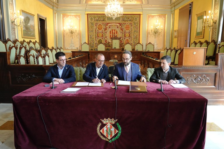 El paer en cap, Miquel Pueyo, i el conseller de Territori, Juli Fernández, han signat avui el conveni que farà possible l’obra que permetrà que les persones que treballen en aquesta zona industrial puguin arribar-hi en tren