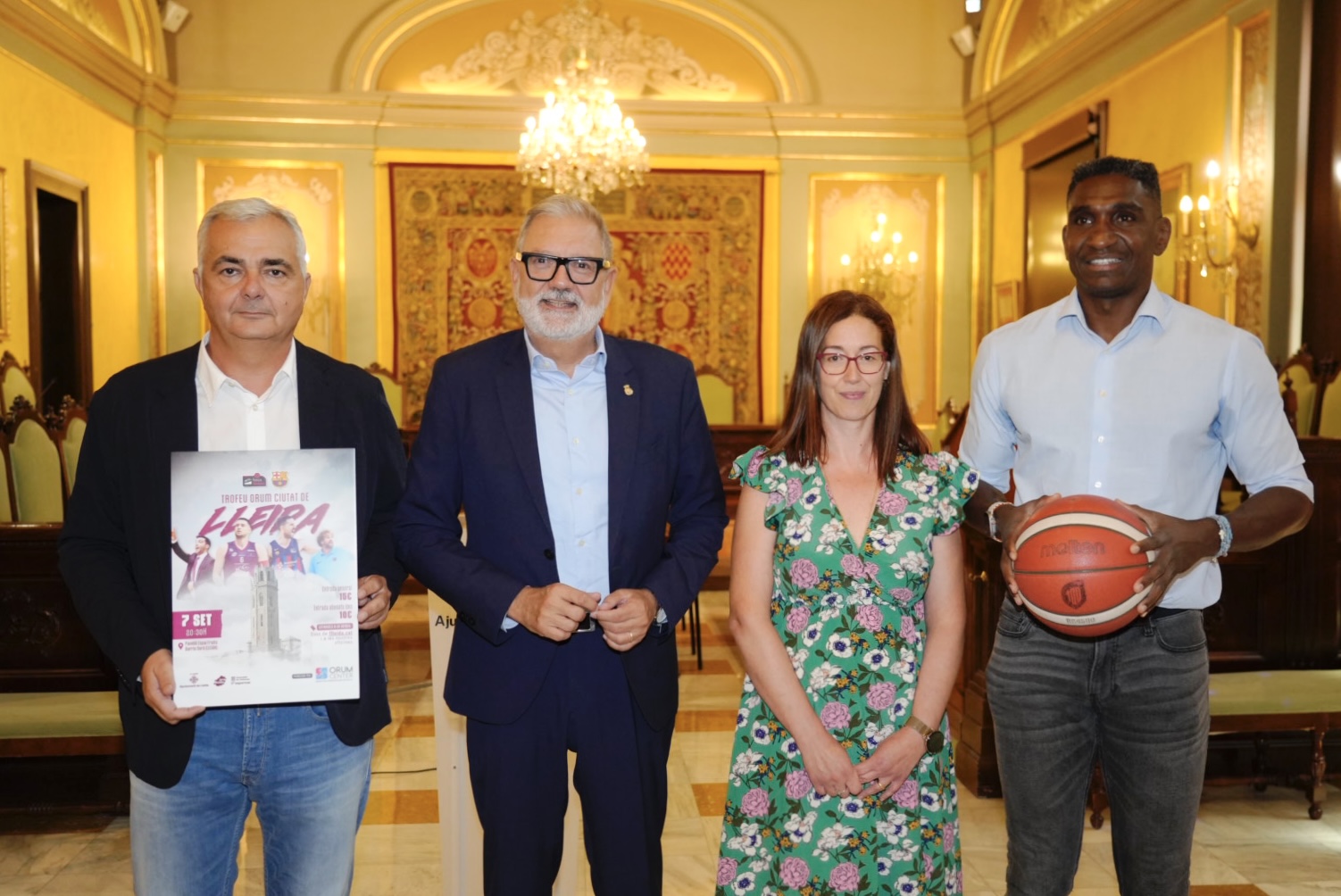L’alcalde de Lleida, Fèlix Larrosa, i el regidor d’esports, Jackson Quiñonez, acompanyats del president del Força Lleida, Albert Aliaga, i de la cap de gestió i atenció a l’usuari d’Orum, Rosa Fondevila, han presentat l’edició 2023 del Trofeu Orum Ciutat de Lleida que es disputarà el proper dia 7 de setembre, a les 20.30 hores, al pavello municipal Barris Nord, amb el partit entre l’ICG Força Lleida i el Barça de Roger Grimau.