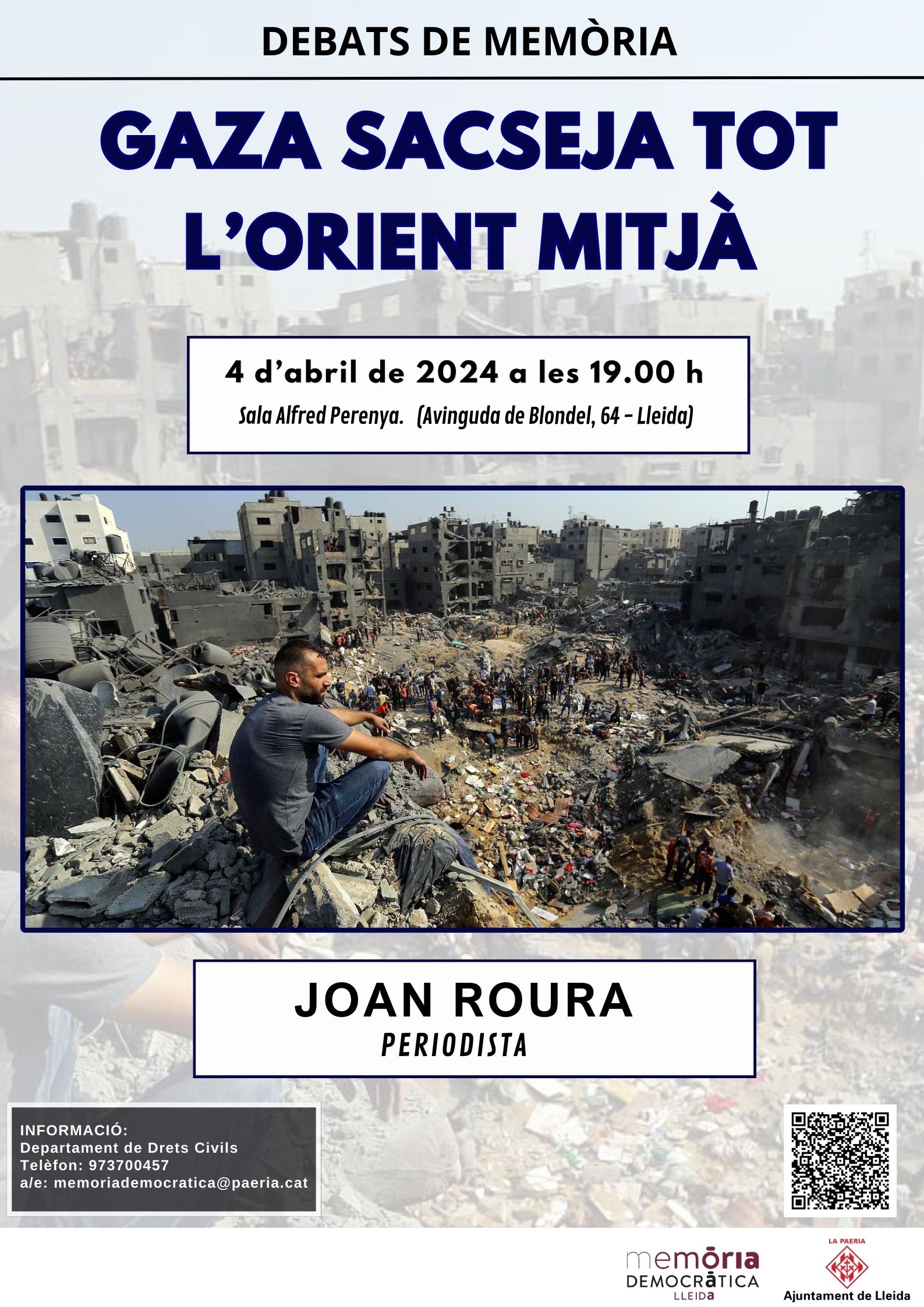 L'àrea de Drets Civils de l'Ajuntament de Lleida organitza una conferència dins del cicle de Debats de Memòria per al dijous, 4 d’abril, amb el títol ”Gaza sacseja tot l’Orient Mitjà”, a càrrec del periodista Joan Roura.