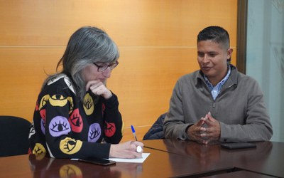 La regidora Sandra Castro s’ha reunit a la Paeria amb Alex Guanga, activista i líder indígena, que està fent una gira per Europa i ha fet parada a Lleida per la implicació de la Paeria en la denúncia i visibilització d’aquesta situació i el treball que fa en la defensa dels drets humans.