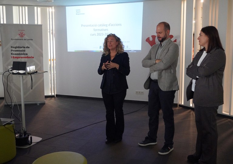 El programa Lleida Talent Emprenedor, que enguany arriba a la 10a edició, ja està en marxa amb la proposta formativa per al curs 2023-24, amb 57 tallers per a alumnat i 10 per a personal docent. La regidora de Cultura i Promoció de la Ciutat, Pilar Bosch, i el diputat i vicepresident del Patronat de Promoció Econòmica de la Diputació de Lleida, Jordi Verdú, acompanyats de la inspectora dels Serveis Territorials a Lleida del Departament d’Educació, Alba Orobitg, han presentat el programa als centres perquè coneguin de primera mà el que s’ha preparat per aquest curs. És un catàleg que es posa a disposició dels centres educatius de la demarcació de Lleida amb l’objectiu de promoure l’esperit emprenedor a l’escola mitjançant accions i activitats adreçades a l’alumnat i al professorat.