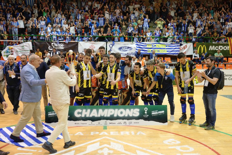 El paer en cap, Miquel Pueyo, ha lliurat al Club Patí Voltregà el trofeu de la World Skate Europe Final Four que s’ha disputat aquest cap de setmana al pavelló Onze de Setembre de Lleida. L’equip osonenc ha vençut en la final a l’HC Braga (Portugal) amb un marcador molt ajustat, 4 a 5.