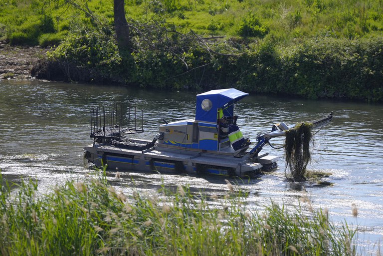 Un vehicle amfibi conduït per un operari talla les plantes i les restes vegetals es recullen després aigües avall amb un sistema de retenció, perquè es puguin compostar i convertir en adob orgànic. Durant aquest període, el riu tindrà només el cabal ecològic per tal de facilitar el moviment del vehicle amfibi.