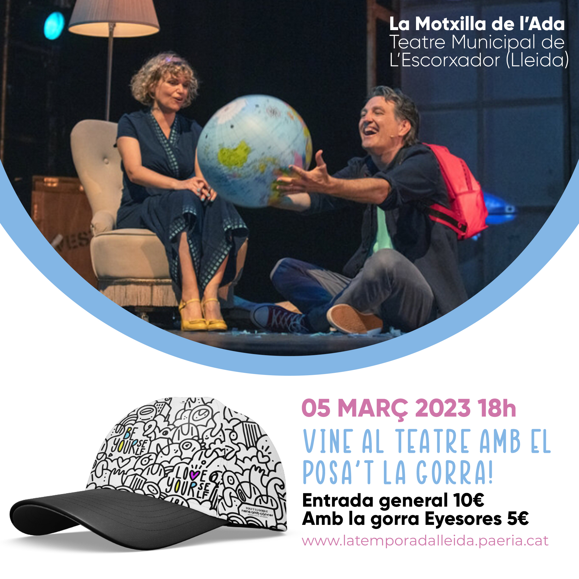 La Temporada Lleida ha programat l’espectacle “La motxilla de l’Ada” en el marc de l’activitat “Posa’t la gorra”, que se celebra aquest diumenge al matí al Turó de la Seu Vella. Per la tarda, a les 18.00 hores, el Teatre Municipal de l’Escorxador acollirà aquesta obra de teatre dins de la programació “Amb la Tribu”. Les persones que assisteixin amb la gorra Eyesores d’enguany tindran un preu de 5 € en la compra d’entrades. La resta, el preu de l’entrada general és de 10 € i per als Amics i les Amigues de LaTemporada, és de 9 €.