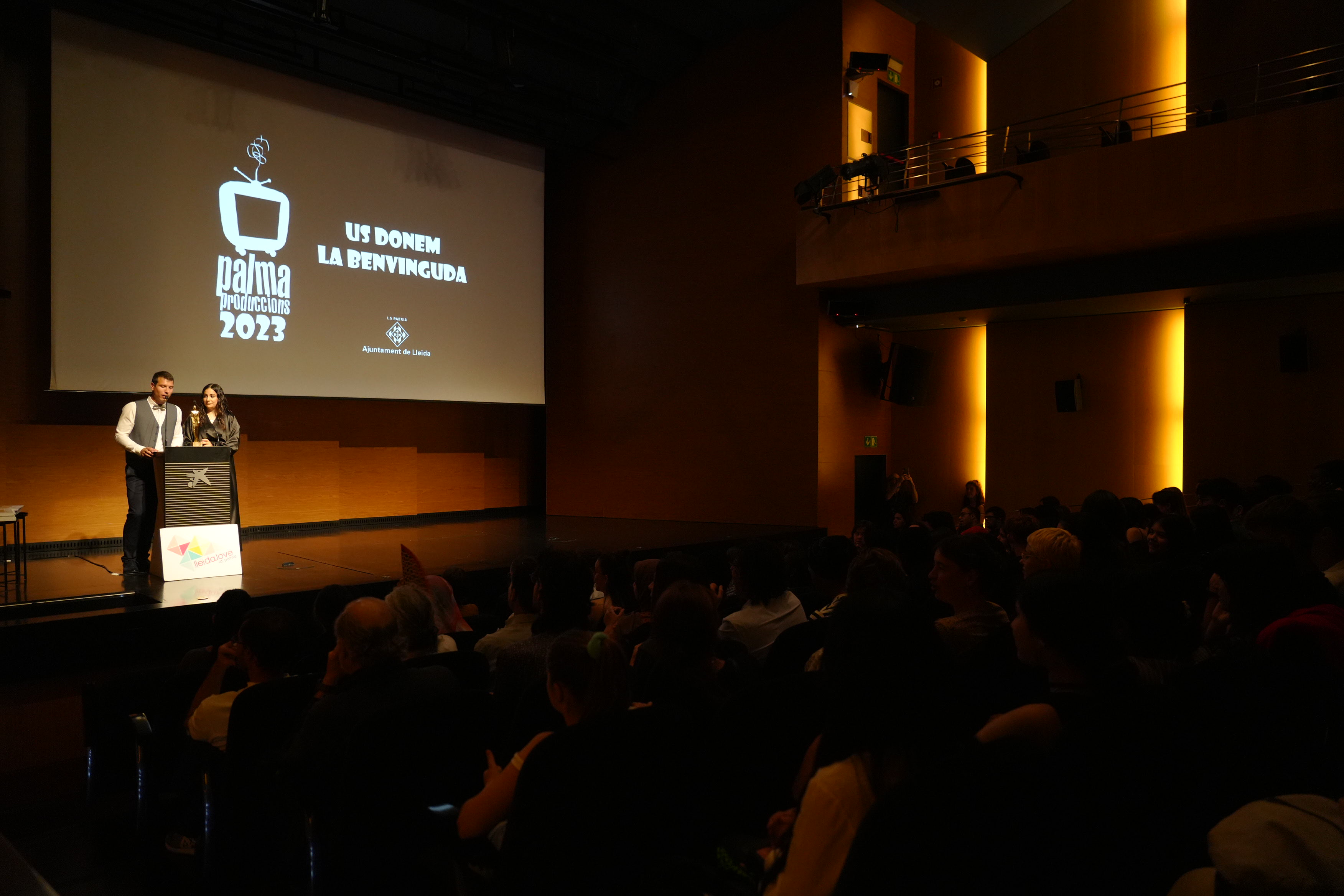 El Caixafòrum Lleida ha acollit l’estrena dels curtmetratges Palma Produccions 2023. L’alcalde de Lleida, Miquel Pueyo, acompanyat del regidor de Joventut, Festes i Esports, Ignasi Amor, ha assistit al lliurament dels premis Palma d’Or als 17 curts realitzats en aquesta desena edició per 200 joves de diferents instituts i entitats durant el curs escolar.