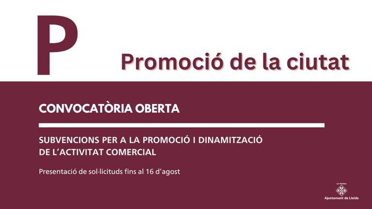 La Regidoria de Promoció de la Ciutat va obrir la convocatòria per a la promoció i dinamització de l'activitat comercial 2024 el dia 15 de juliol i aquesta restarà oberta fins al 16 d'agost. La dotació total de les subvencions és de 50.000 € i es tracta d’una convocatòria en concurrència competitiva. Les ajudes estan adreçades a les associacions de comerciants de la Lleida que vulguin fomentar la seva activitat mitjançant accions de promoció i dinamització.