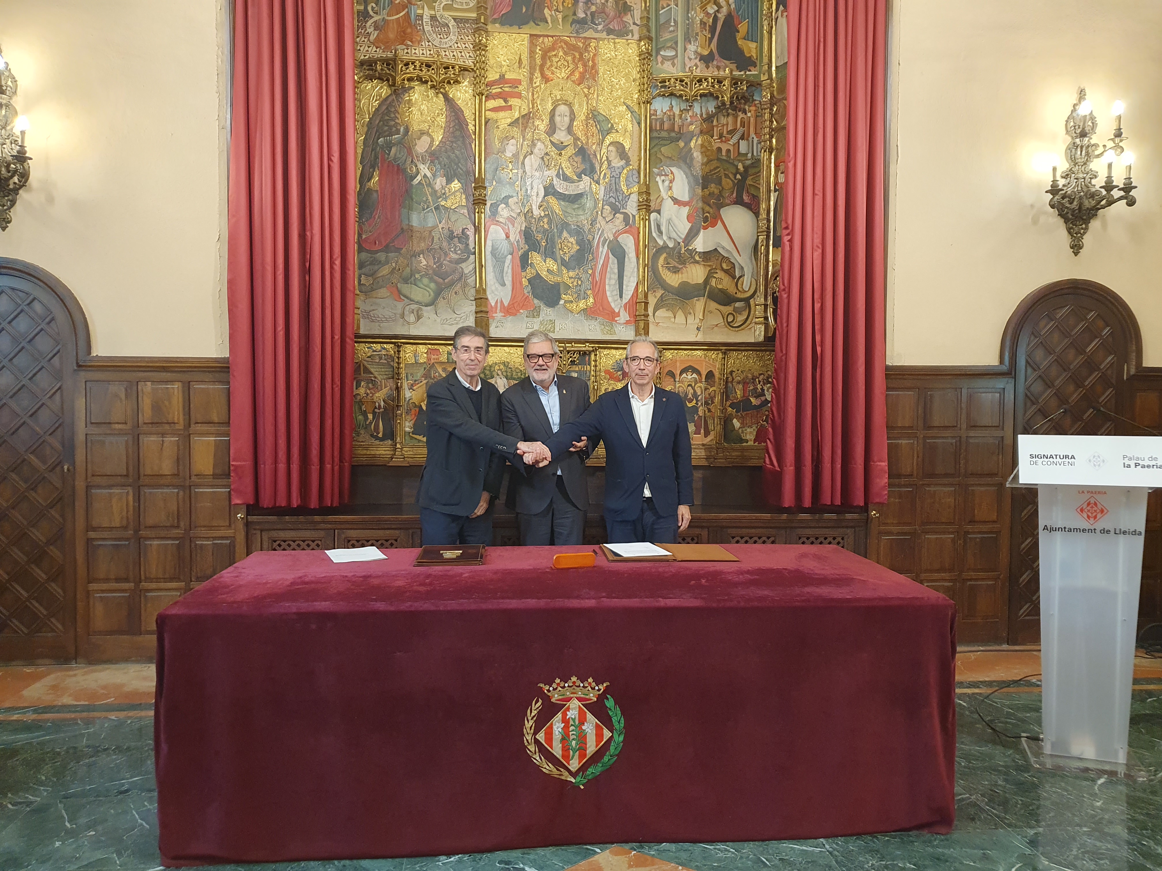 La Paeria i la UdL treballaran conjuntament per impulsar la marca “Lleida, ciutat universitària” amb l’objectiu d’atraure i promoure el talent jove que actualment demanden les empreses. Aquest dilluns el paer en cap, Fèlix Larrosa, i el rector de la Universitat, Jaume Puy, han signat el protocol de col·laboració entre ambdues institucions que s’articularà en quatre eixos: connectivitat, transport públic i senyalització; habitatge, oferta cultural, turística, comercial i d’oci i comunicació.