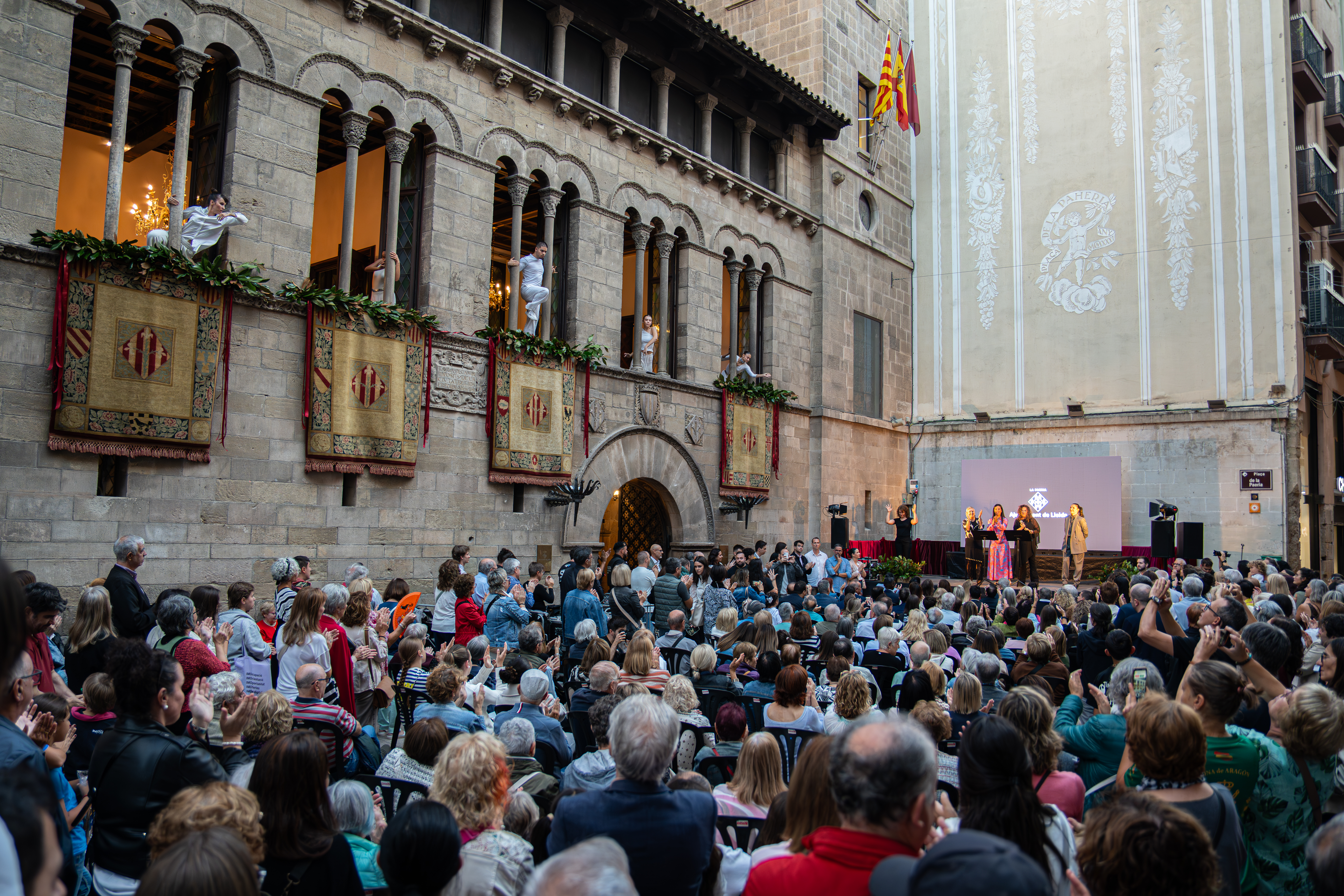 La plaça de la Paeria ha acollit aquesta tarda el tret d’inici de les Festes de la Tardor d’enguany. El pregó ha anat a càrrec d’Irene Cascos, Montse Lozano, Sandra Macià i Rosa M. Sánchez, quatre dones que han fet de la dansa una passió compartida i un llegat per a joves generacions de ballarins i ballarines de la ciutat. La seva proposta ha combinat un espectacle de dansa contemporània i clàssica, realitzat per alumnes de les seves escoles a les finestres de la façana del Palau de la Paeria.