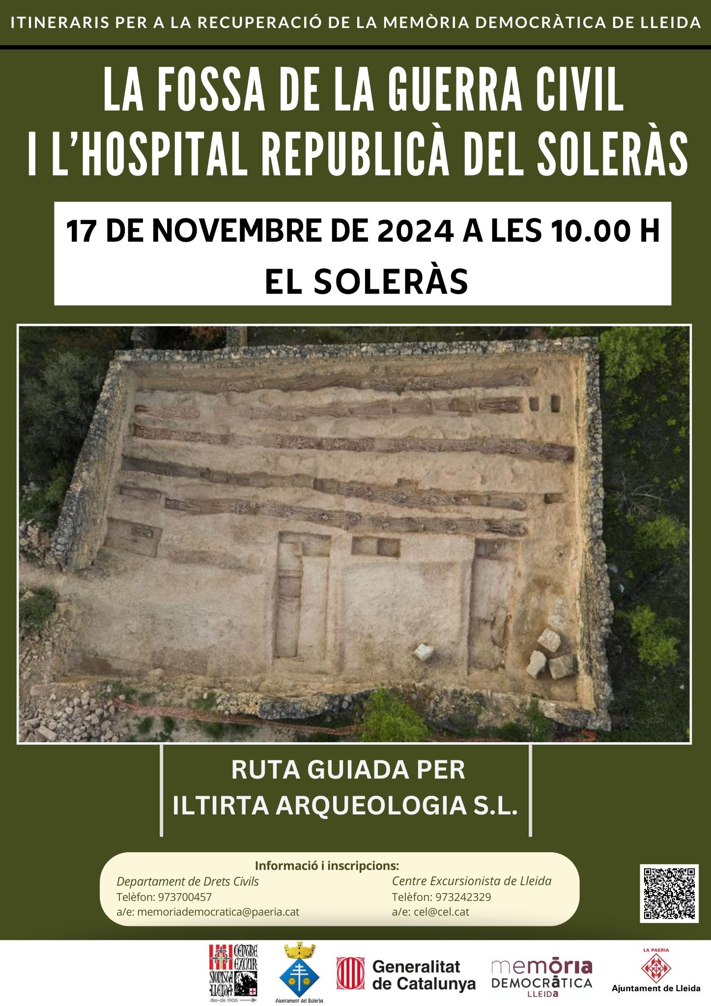 L’Ajuntament de Lleida ha organitzat un nou itinerari de Memòria Democràtica que, en aquest cas, tindrà lloc a la població del Soleràs. La sortida es farà aquest diumenge, dia 17 de novembre, a les 10 h, i s’emmarca en el programa d’activitats que l’àrea de Memòria Democràtica del Departament de Drets Civils ha preparat per a aquest darrer trimestre. La visita, que porta per títol “La fossa de la Guerra Civil i l’hospital republicà del Soleràs”, serà conduïda per l’empresa Iltirta Arqueologia, SL. Per participar-hi, cal inscriure’s a Memòria Democràtica (al tel. 973 700 457 o al correu electrònic memoriademocratica@paeria.cat) o al Centre Excursionista de Lleida (973 242 329 / cel@cel.cat).