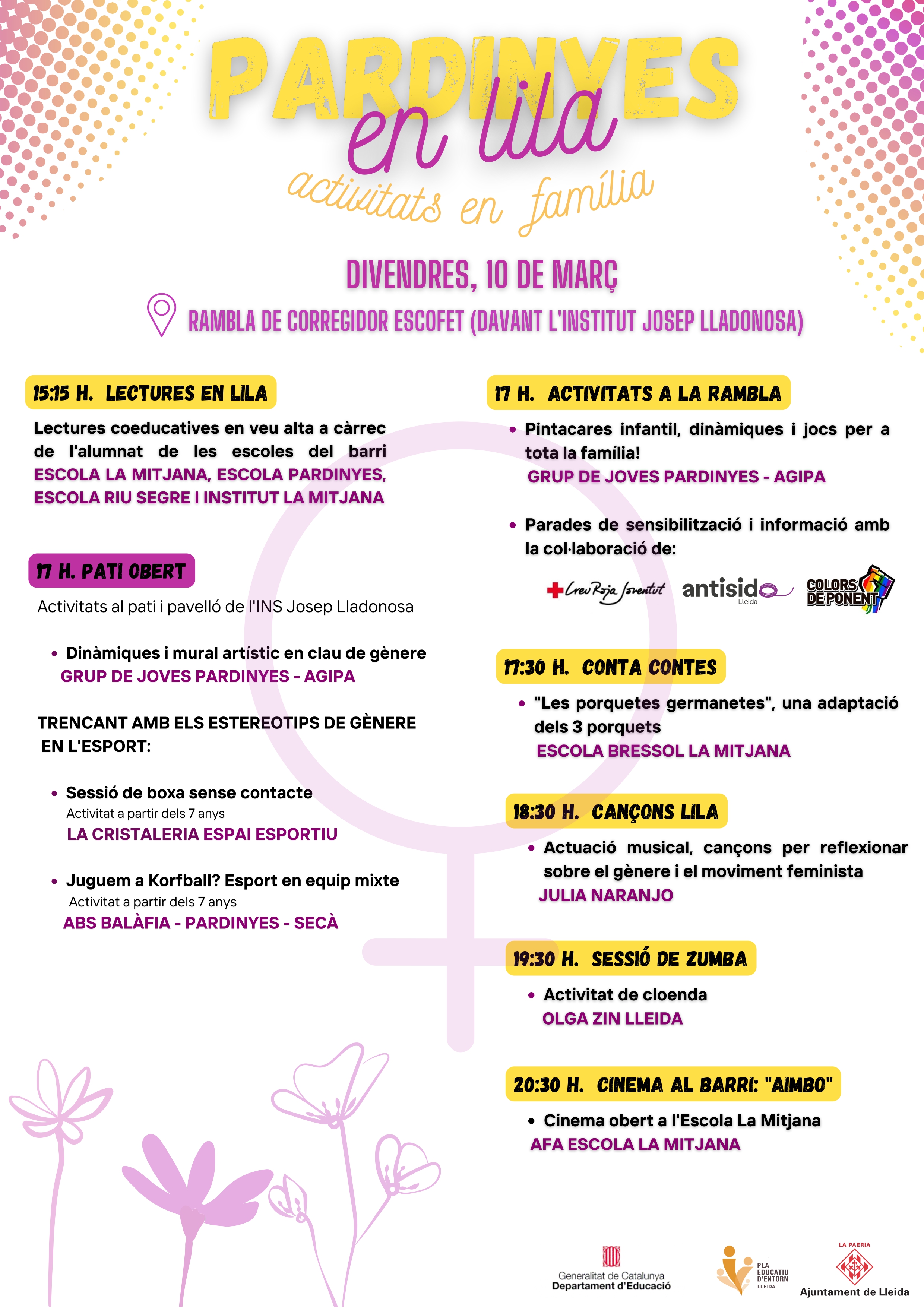 La jornada començarà amb Lectures coeducatives en clau “lila” a càrrec de l’alumnat de les escoles del barri: La Mitjana, Pardinyes, Riu Segre i Institut La Mitjana. A les 17 h, al pati i el pavelló de l’INS Lladonosa, hi haurà dinàmiques i un mural artístic, a càrrec del grup de joves Pardinyes (Agipa) i sessions de boxa sense contacte (La Cristaleria Espai Esportiu) i Korfball (EAP Balàfia- Pardinyes-Secà), per trencar estereotips de gènere en l’esport. A la mateixa hora, a la rambla, Agipa preparà un pintacares infantil, dinàmiques i jocs per a la família. Creu Roja Joventut, Antisida Lleida i Colors de Ponent tindran parades de sensibilització i informació.
