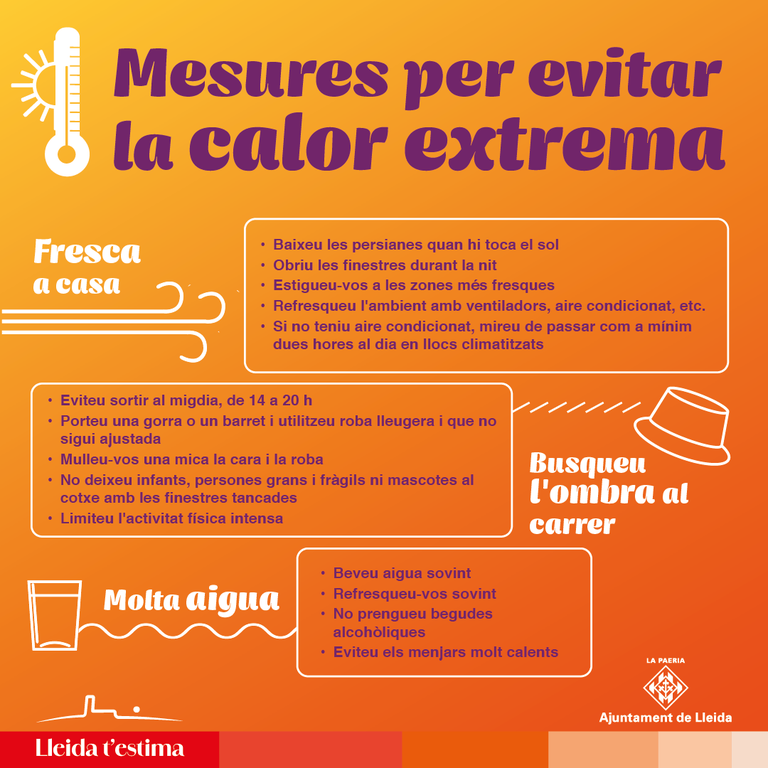 L’Ajuntament de Lleida recorda a la població la importància de beure aigua sovint, evitar sortir al carrer durant les franges de més calor, refrescar els domicilis, reduir l’activitat física intensa en les hores centrals del dia i prestar especial atenció a infants, gent gran i persones amb malalties cròniques. També recorda els refugis climàtics que la ciutadania té a l'abast.