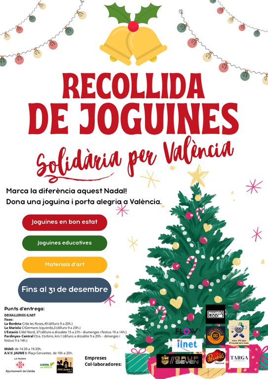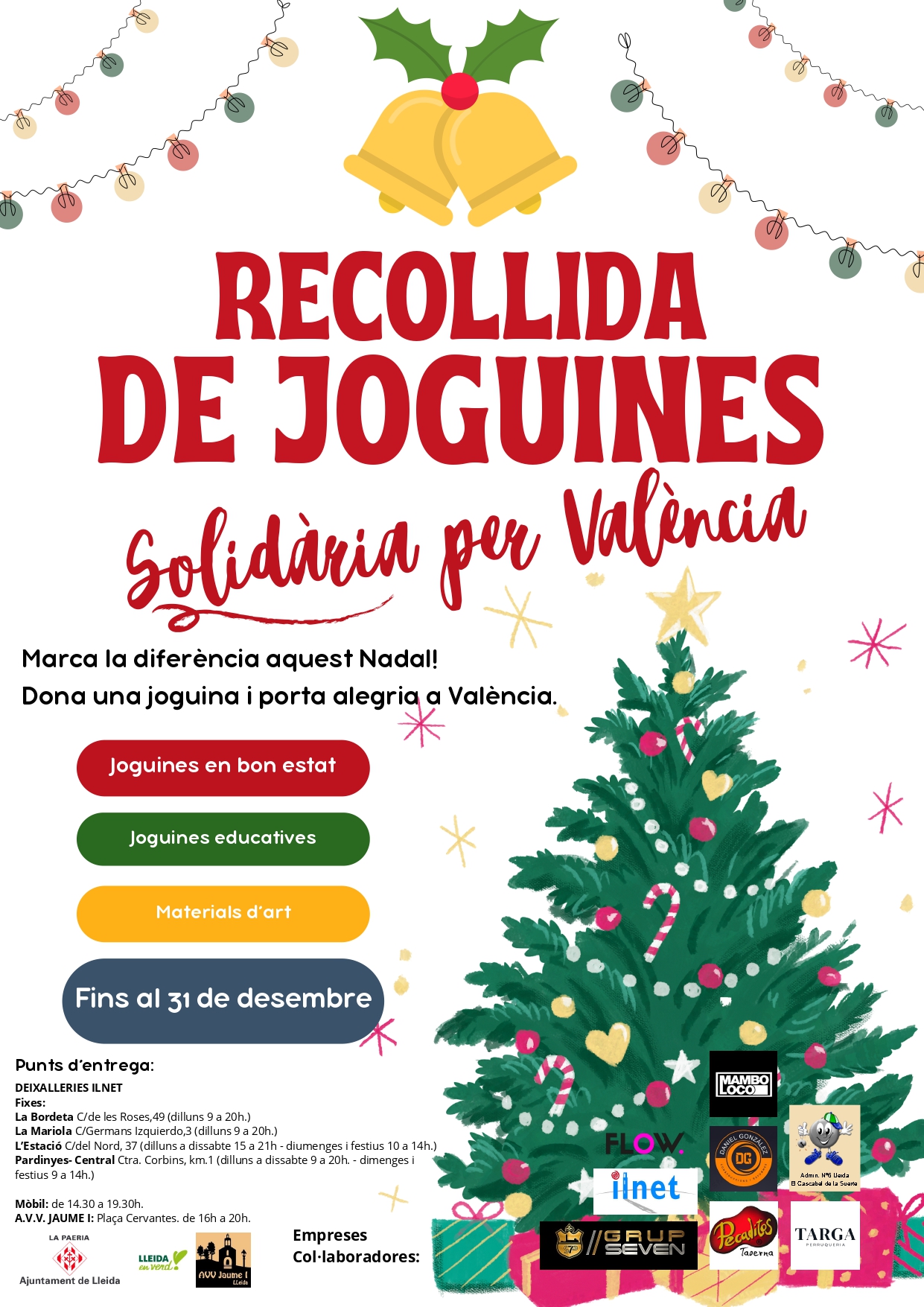 L’Associació Veïnal Jaume I, i un grup de ciutadans i ciutadanes de Lleida, entre els quals es troben membres de la Guàrdia Urbana que ja van participar activament en les tasques de neteja a la zona afectada per la DANA a València, han posat en marxa “Marca la diferència aquest Nadal! Dona una joguina i porta alegria a València”, una campanya solidària amb l'objectiu de recollir joguines per a les famílies damnificades per la DANA.