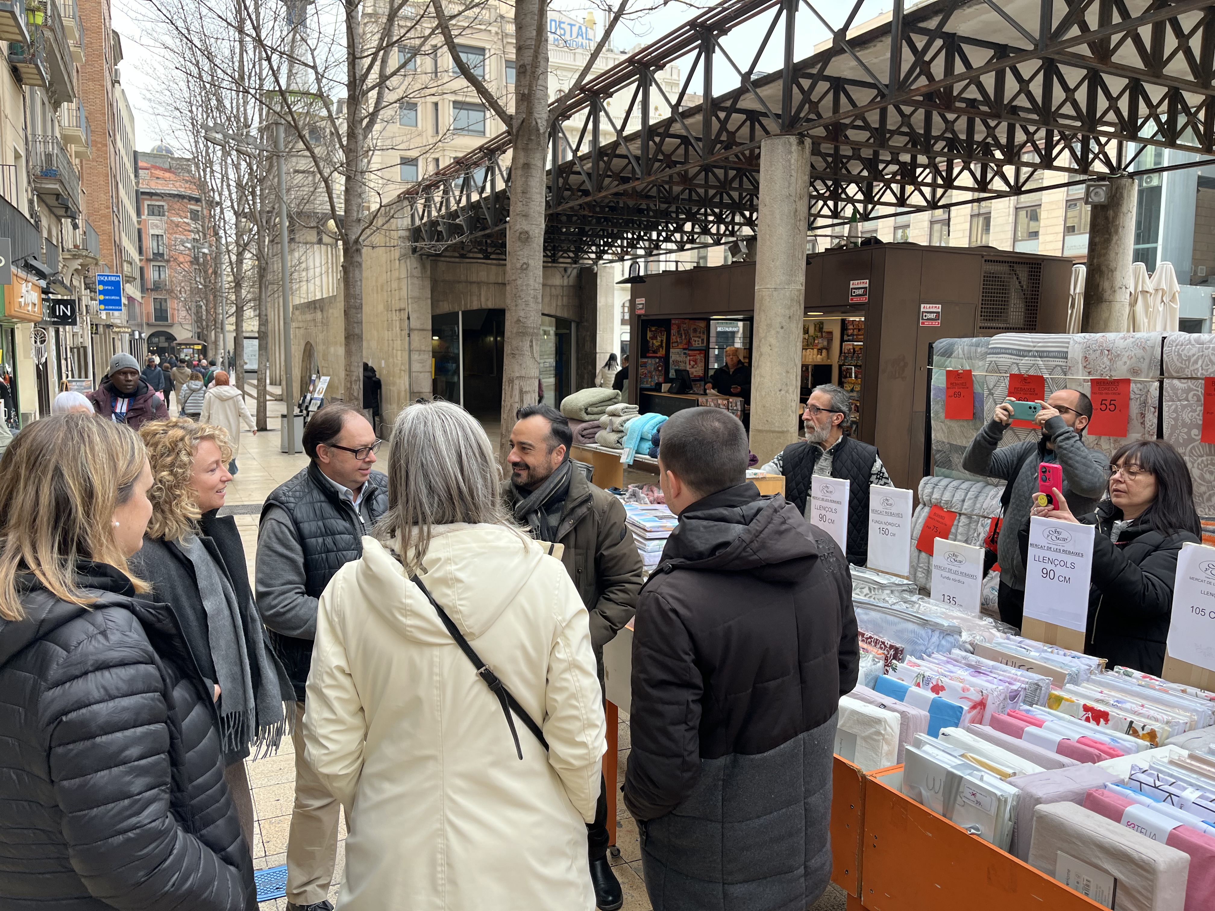 La regidora de Cultura i Promoció de la Ciutat, Pilar Bosch, ha visitat aquest matí el mercat per donar suport al comerç local. Ha estat acompanyada per la presidenta de la Federació d'Associacions de Comerciants de l'Eix Comercial de Lleida, Montse Eritja, i pel president de PIMEComerç, Manel Llaràs, entre altres representants dels comerciants. També hi han assistit els regidors Neus Caufapé i Josep Roca.