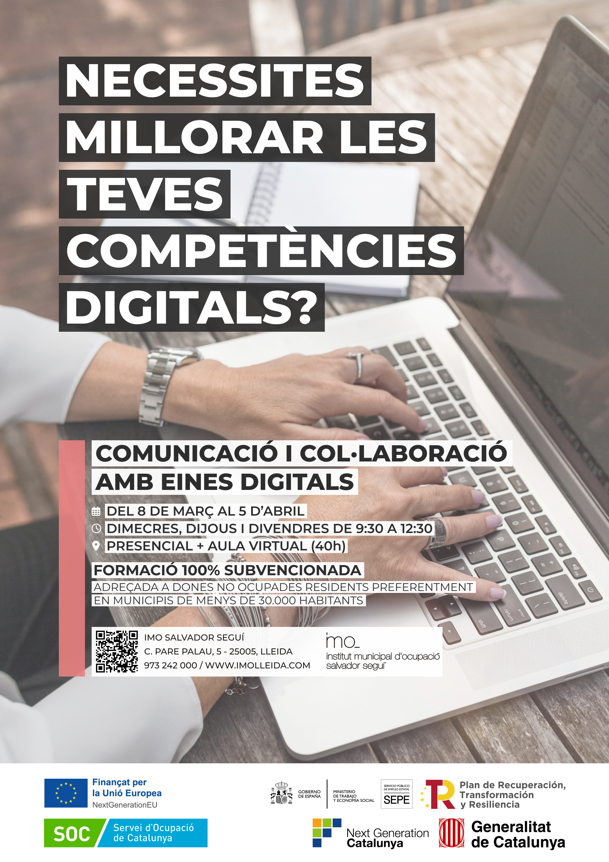 L’Institut Municipal d’Ocupació (IMO) Salvador Seguí impartirà els propers mesos una acció formativa sobre comunicació i col·laboració amb eines digitals que estarà finançat amb els fons europeus Next GenerationEU.
